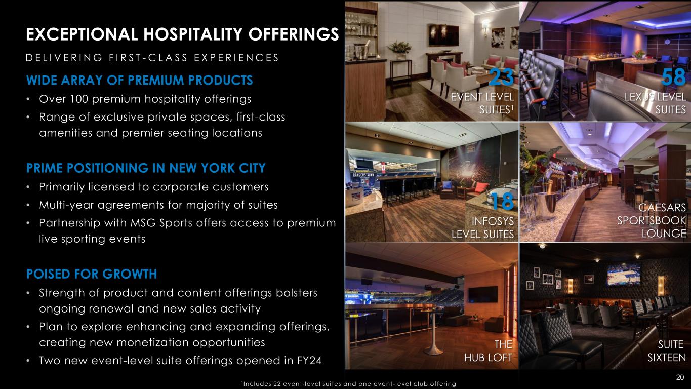 STRONG MARKETING PARTNERSHIP TRACK RECORD S P O N S O R S H I P R E L A T I O N S H I P S D E L I V E R C O M P E L L I N G V A L U E INNOVATIVE MARKETING PARTNERSHIP OFFERINGS • Sought-after entertainment brands • Significant exposure in NYC • Cross-selling opportunities with MSG Sports VALUABLE MULTI-YEAR PARTNERSHIPS • Signature and Marquee partners represent majority of sponsorship revenue ATTRACTIVE GROWTH OPPORTUNITIES • Utilizing integrated approach to renew existing partners • Targeting emerging and underpenetrated verticals • New relationship formed with Oak View Group and Crown Properties Collection in September 2023 19