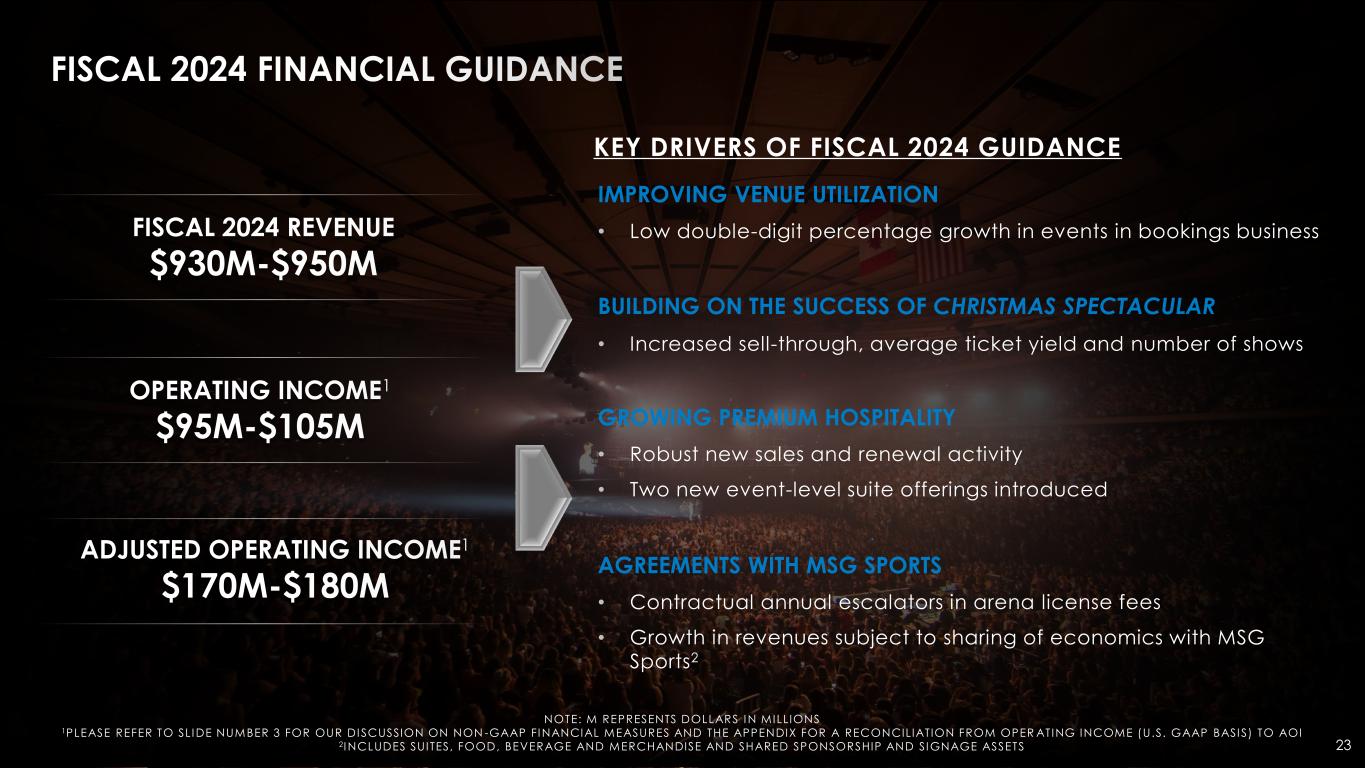 FISCAL 2024 REVENUE $930M-$950M ADJUSTED OPERATING INCOME1 $170M-$180M FISCAL 2024 FINANCIAL GUIDANCE OPERATING INCOME1 $95M-$105M 23 KEY DRIVERS OF FISCAL 2024 GUIDANCE IMPROVING VENUE UTILIZATION • Low double-digit percentage growth in events in bookings business BUILDING ON THE SUCCESS OF CHRISTMAS SPECTACULAR • Increased sell-through, average ticket yield and number of shows GROWING PREMIUM HOSPITALITY • Robust new sales and renewal activity • Two new event-level suite offerings introduced AGREEMENTS WITH MSG SPORTS • Contractual annual escalators in arena license fees • Growth in revenues subject to sharing of economics with MSG Sports2 NOTE: M REPRESENTS DOLLARS IN MILLIONS 1PLEASE REFER TO SLIDE NUMBER 3 FOR OUR DISCUSSION ON NON -GAAP FINANCIAL MEASURES AND THE APPENDIX FOR A RECONCILIATION FROM OPER ATING INCOME (U.S. GAAP BASIS) TO AOI 2INCLUDES SUITES, FOOD, BEVERAGE AND MERCHANDISE AND SHARED SPONSORSHIP AND SIGNAGE ASSETS