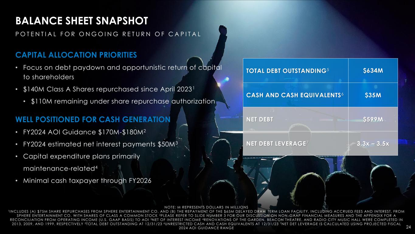 BALANCE SHEET SNAPSHOT P O T E N T I A L F O R O N G O I N G R E T U R N O F C A P I T A L 24 TOTAL DEBT OUTSTANDING5 $634M CASH AND CASH EQUIVALENTS6 $35M NET DEBT $599M NET DEBT LEVERAGE7 3.3x – 3.5x CAPITAL ALLOCATION PRIORITIES • Focus on debt paydown and opportunistic return of capital to shareholders • $140M Class A Shares repurchased since April 20231 • $110M remaining under share repurchase authorization WELL POSITIONED FOR CASH GENERATION • FY2024 AOI Guidance $170M-$180M2 • FY2024 estimated net interest payments $50M3 • Capital expenditure plans primarily maintenance-related4 • Minimal cash taxpayer through FY2026 NOTE: M REPRESENTS DOLLARS IN MILLIONS 1INCLUDES (A) $75M SHARE REPURCHASES FROM SPHERE ENTERTAINMENT CO. AND (B) THE REPAYMENT OF THE $65M DELAYED DRAW TERM LOAN FACIL I TY, INCLUDING ACCRUED FEES AND INTEREST, FROM SPHERE ENTERTAINMENT CO. WITH SHARES OF CLASS A COMMON STOCK 2PLEASE REFER TO SLIDE NUMBER 3 FOR OUR DISCUSSION ON NON -GAAP FINANCIAL MEASURES AND THE APPENDIX FOR A RECONCILIATION FROM OPERATING INCOME (U.S. GAAP BASIS) TO AOI 3NET OF INTEREST INCOME 4RENOVATIONS OF THE GARDEN, BEACON THEATRE, AND RADIO CI TY MUSIC HALL WERE COMPLETED IN 2013, 2009, AND 1999, RESPECTIVELY 5TOTAL DEBT OUTSTANDING AT 12/31/23 6UNRESTRICTED CASH AND CASH EQUIVALENTS AT 12/31/23 7NET DET LEVERAGE I S CALCULATED USING PROJECTED FI SCAL 2024 AOI GUIDANCE RANGE