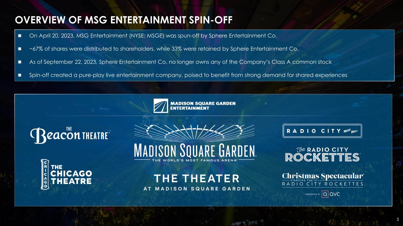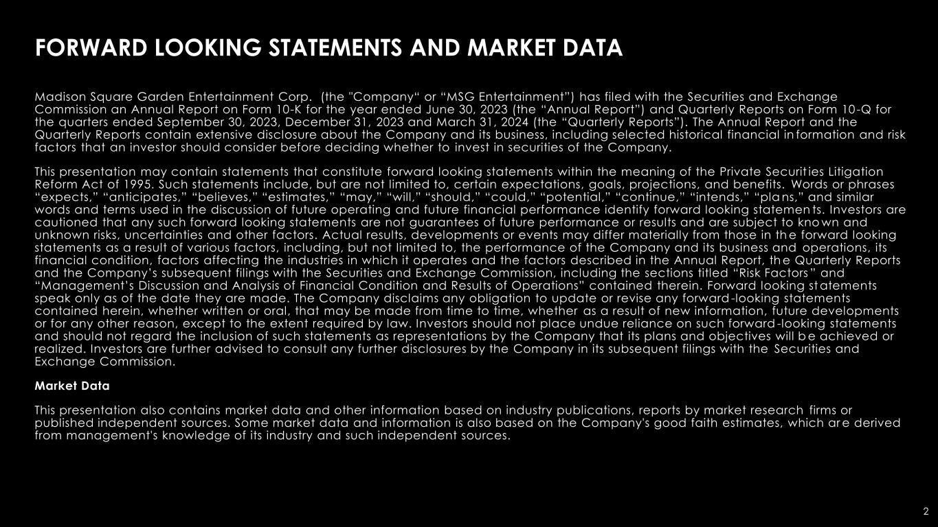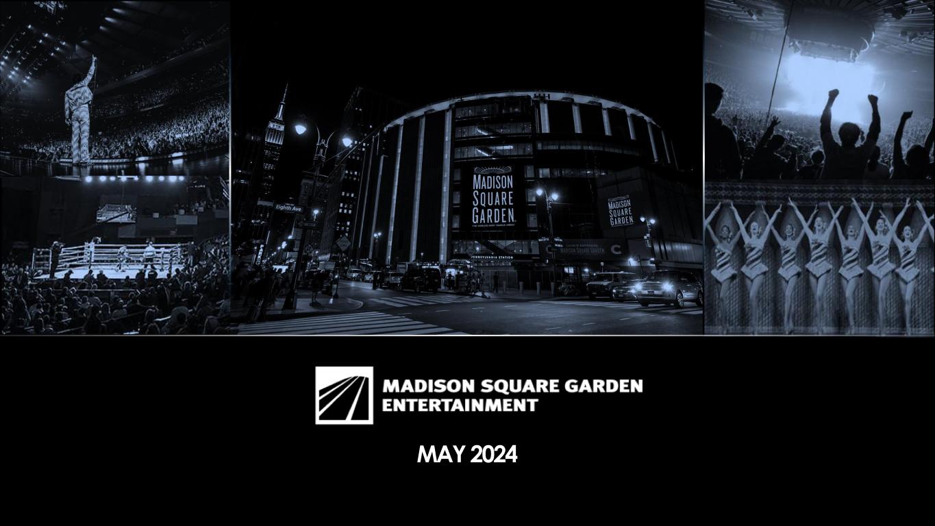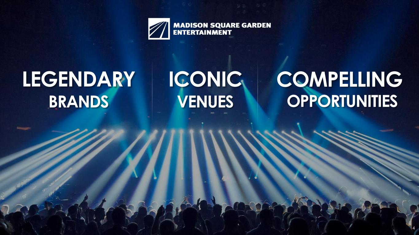 2 FORWARD LOOKING STATEMENTS AND MARKET DATA Madison Square Garden Entertainment Corp. (the "Company“ or “MSG Entertainment”) has filed with the Securities and Exchange Commission an Annual Report on Form 10-K for the year ended June 30, 2023 (the “Annual Report”) and Quarterly Reports on Form 10 -Q for the quarters ended September 30, 2023, December 31, 2023 and March 31, 2024 (the “Quarterly Reports”). The Annual Report and the Quarterly Reports contain extensive disclosure about the Company and its business, including selected historical financial in formation and risk factors that an investor should consider before deciding whether to invest in securities of the Company. This presentation may contain statements that constitute forward looking statements within the meaning of the Private Securit ies Litigation Reform Act of 1995. Such statements include, but are not limited to, certain expectations, goals, projections, and benefits. Words or phrases “expects,” “anticipates,” “believes,” “estimates,” “may,” “will,” “should,” “could,” “potential,” “continue,” “intends,” “pla ns,” and similar words and terms used in the discussion of future operating and future financial performance identify forward looking statemen ts. Investors are cautioned that any such forward looking statements are not guarantees of future performance or results and are subject to kno wn and unknown risks, uncertainties and other factors. Actual results, developments or events may differ materially from those in th e forward looking statements as a result of various factors, including, but not limited to, the performance of the Company and its business and operations, its financial condition, factors affecting the industries in which it operates and the factors described in the Annual Report, th e Quarterly Reports and the Company’s subsequent filings with the Securities and Exchange Commission, including the sections titled “Risk Factors ” and “Management’s Discussion and Analysis of Financial Condition and Results of Operations” contained therein. Forward looking st atements speak only as of the date they are made. The Company disclaims any obligation to update or revise any forward -looking statements contained herein, whether written or oral, that may be made from time to time, whether as a result of new information, future developments or for any other reason, except to the extent required by law. Investors should not place undue reliance on such forward -looking statements and should not regard the inclusion of such statements as representations by the Company that its plans and objectives will b e achieved or realized. Investors are further advised to consult any further disclosures by the Company in its subsequent filings with the Securities and Exchange Commission. Market Data This presentation also contains market data and other information based on industry publications, reports by market research firms or published independent sources. Some market data and information is also based on the Company's good faith estimates, which ar e derived from management's knowledge of its industry and such independent sources.