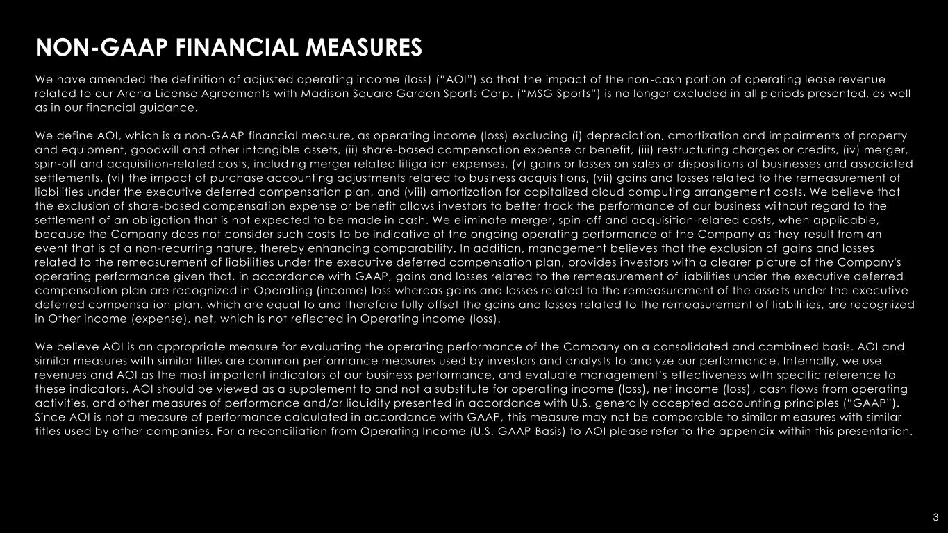 3 NON-GAAP FINANCIAL MEASURES We have amended the definition of adjusted operating income (loss) (“AOI”) so that the impact of the non -cash portion of operating lease revenue related to our Arena License Agreements with Madison Square Garden Sports Corp. (“MSG Sports”) is no longer excluded in all p eriods presented, as well as in our financial guidance. We define AOI, which is a non-GAAP financial measure, as operating income (loss) excluding (i) depreciation, amortization and im pairments of property and equipment, goodwill and other intangible assets, (ii) share-based compensation expense or benefit, (iii) restructuring charges or credits, (iv) merger, spin-off and acquisition-related costs, including merger related litigation expenses, (v) gains or losses on sales or dispositio ns of businesses and associated settlements, (vi) the impact of purchase accounting adjustments related to business acquisitions, (vii) gains and losses rela ted to the remeasurement of liabilities under the executive deferred compensation plan, and (viii) amortization for capitalized cloud computing arrangeme nt costs. We believe that the exclusion of share-based compensation expense or benefit allows investors to better track the performance of our business wi thout regard to the settlement of an obligation that is not expected to be made in cash. We eliminate merger, spin -off and acquisition-related costs, when applicable, because the Company does not consider such costs to be indicative of the ongoing operating performance of the Company as they result from an event that is of a non-recurring nature, thereby enhancing comparability. In addition, management believes that the exclusion of gains and losses related to the remeasurement of liabilities under the executive deferred compensation plan, provides investors with a clearer picture of the Company's operating performance given that, in accordance with GAAP, gains and losses related to the remeasurement of liabilities under the executive deferred compensation plan are recognized in Operating (income) loss whereas gains and losses related to the remeasurement of the asse ts under the executive deferred compensation plan, which are equal to and therefore fully offset the gains and losses related to the remeasurement o f liabilities, are recognized in Other income (expense), net, which is not reflected in Operating income (loss). We believe AOI is an appropriate measure for evaluating the operating performance of the Company on a consolidated and combin ed basis. AOI and similar measures with similar titles are common performance measures used by investors and analysts to analyze our performanc e. Internally, we use revenues and AOI as the most important indicators of our business performance, and evaluate management’s effectiveness with specific reference to these indicators. AOI should be viewed as a supplement to and not a substitute for operating income (loss), net income (loss) , cash flows from operating activities, and other measures of performance and/or liquidity presented in accordance with U.S. generally accepted accountin g principles (“GAAP”). Since AOI is not a measure of performance calculated in accordance with GAAP, this measure may not be comparable to similar m easures with similar titles used by other companies. For a reconciliation from Operating Income (U.S. GAAP Basis) to AOI please refer to the appen dix within this presentation.