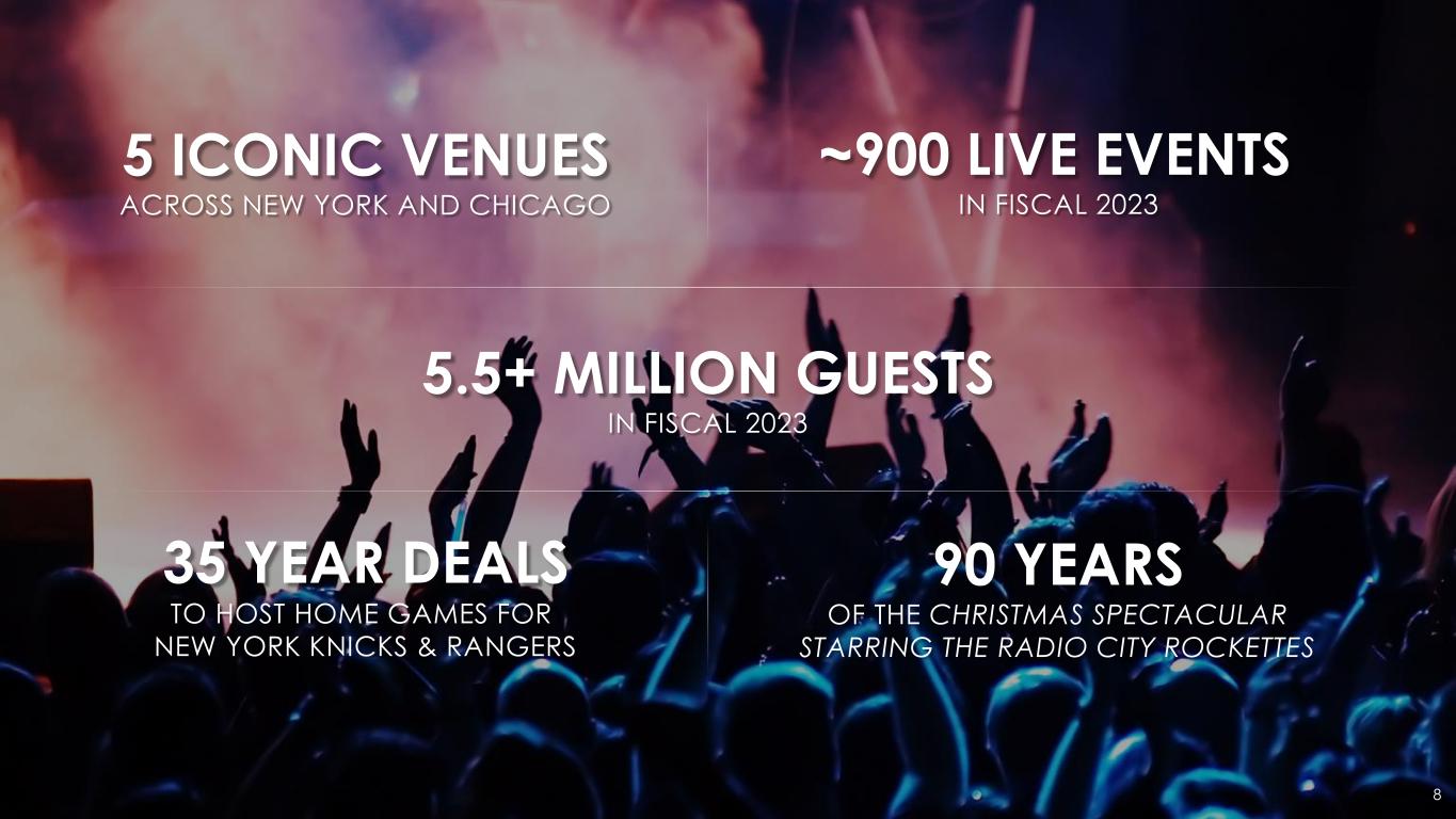 8 90 YEARS OF THE CHRISTMAS SPECTACULAR STARRING THE RADIO CITY ROCKETTES 35 YEAR DEALS TO HOST HOME GAMES FOR NEW YORK KNICKS & RANGERS 5 ICONIC VENUES ACROSS NEW YORK AND CHICAGO ~900 LIVE EVENTS IN FISCAL 2023 5.5+ MILLION GUESTS IN FISCAL 2023
