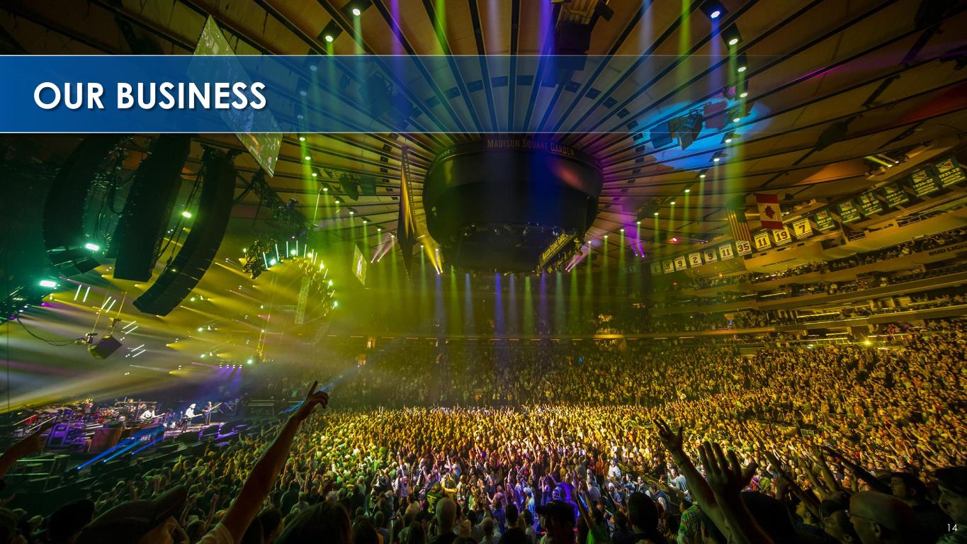 13 VALUABLE REAL ESTATE HOLDINGS O U R V E N U E S VENUE MARKET SIZE NEW YORK CITY ~1.1M SQ. FT. BUILDING NEW YORK CITY PART OF THE GARDEN CHICAGO ~73K SQ. FT. BUILDING VENUE MARKET SIZE EXPIRATION NEW YORK CITY ~577K SQ. FT. BUILDING 20381 NEW YORK CITY ~57K SQ. FT. BUILDING 20362 O W N E D LE A S E D 1RADIO CI TY MUSIC HALL’S LEASE EXPIRES IN 2038 WITH AN OPTION TO RENEW FOR AN ADDITIONAL TEN YEARS 2BEACON THEATRE’S LEASE EXPIRES IN 2036 WITH AN OPTION TO RENEW FOR AN ADDITIONAL TEN YEARS