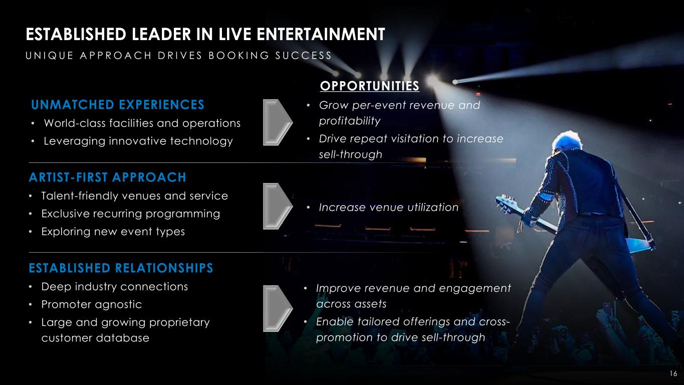 SUBSTANTIAL PRESENCE IN NEW YORK CITY METRO AREA T H E E N T E R T A I N M E N T C A P I T A L O F T H E W O R L D 15 1NEW-YORK-NEWARK (UNITED STATES CENSUS BUREAU) 2NYC & COMPANY FY23 FACT SHEET 3FORTUNE 500 COMPANIES BY REGION REPORT 2022 4TRACKED BY NIELSEN RESEARCH 52023 POLLSTAR CONCERT MARKET RANKINGS (AS OF JANUARY 2024) #1 CONCERT MARKET IN THE U.S.5 23 MILLION+ POPULATION1 RANKED #1 OF 210 DESIGNATED MARKET AREAS4 61 MILLION+ ANNUAL TOURISTS2 HOME TO GREATEST # OF FORTUNE 500 COMPANIES3