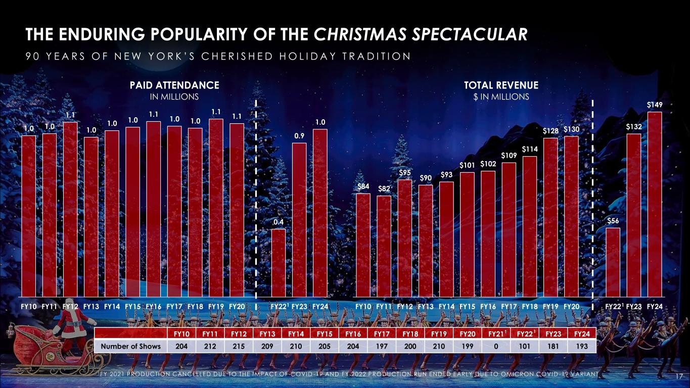 THE ENDURING POPULARITY OF THE CHRISTMAS SPECTACULAR 9 0 Y E A R S O F N E W Y O R K ’ S C H E R I S H E D H O L I D A Y T R A D I T I O N 1FY 2021 PRODUCTION CANCELLED DUE TO THE IMPACT OF COVID -19 AND FY 2022 PRODUCTION RUN ENDED EARLY DUE TO OMICRON COVID -19 VARIANT 17 FY10 FY11 FY12 FY13 FY14 FY15 FY16 FY17 FY18 FY19 FY20 FY21 FY22 FY23 FY24 Number of Shows 204 212 215 209 210 205 204 197 200 210 199 0 101 181 193 1 1 1 1.0 1.0 1.1 1.0 1.0 1.0 1.1 1.0 1.0 1.1 1.1 0.4 0.9 1.0 FY10 FY11 FY12 FY13 FY14 FY15 FY16 FY17 FY18 FY19 FY20 FY22 FY23 FY24 PAID ATTENDANCE IN MILLIONS $84 $82 $95 $90 $93 $101 $102 $109 $114 $128 $130 $56 $132 $149 FY10 FY11 FY12 FY13 FY14 FY15 FY16 FY17 FY18 FY19 FY20 FY22 FY23 FY24 TOTAL REVENUE $ IN MILLIONS 1