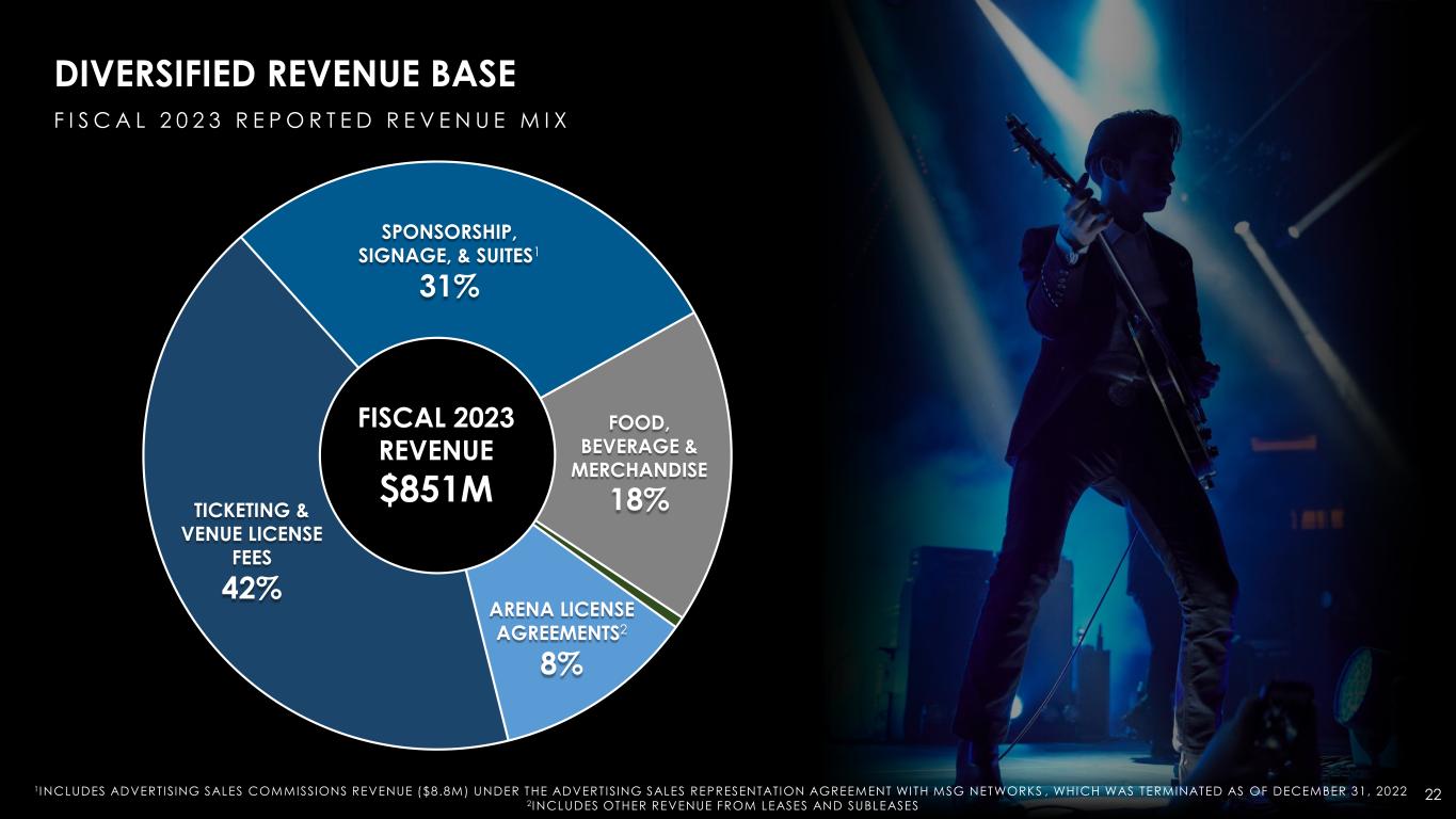 22 ARENA LICENSE AGREEMENTS2 8% SPONSORSHIP, SIGNAGE, & SUITES1 31% FOOD, BEVERAGE & MERCHANDISE 18% FISCAL 2023 REVENUE $851M 1INCLUDES ADVERTISING SALES COMMISSIONS REVENUE ($8.8M) UNDER THE ADVERTISING SALES REPRESENTATION AGREEMENT WITH MSG NETWORKS , WHICH WAS TERMINATED AS OF DECEMBER 31, 2022 2INCLUDES OTHER REVENUE FROM LEASES AND SUBLEASES DIVERSIFIED REVENUE BASE F I S C A L 2 0 2 3 R E P O R T E D R E V E N U E M I X TICKETING & VENUE LICENSE FEES 42%