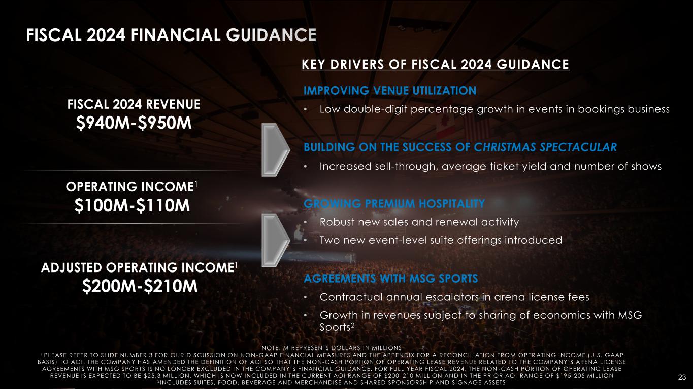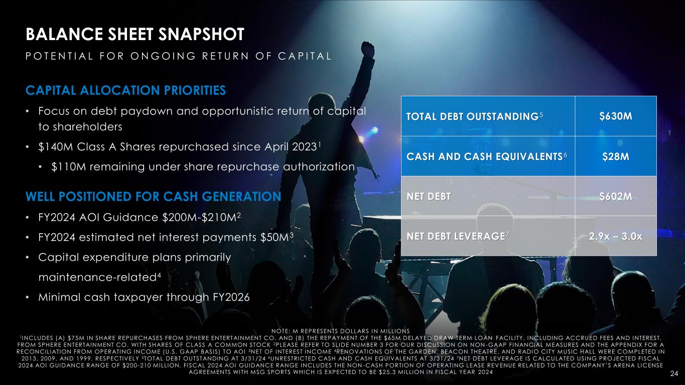 FISCAL 2024 FINANCIAL GUIDANCE 23 KEY DRIVERS OF FISCAL 2024 GUIDANCE IMPROVING VENUE UTILIZATION • Low double-digit percentage growth in events in bookings business BUILDING ON THE SUCCESS OF CHRISTMAS SPECTACULAR • Increased sell-through, average ticket yield and number of shows GROWING PREMIUM HOSPITALITY • Robust new sales and renewal activity • Two new event-level suite offerings introduced AGREEMENTS WITH MSG SPORTS • Contractual annual escalators in arena license fees • Growth in revenues subject to sharing of economics with MSG Sports2 NOTE: M REPRESENTS DOLLARS IN MILLIONS 1 PLEASE REFER TO SLIDE NUMBER 3 FOR OUR DISCUSSION ON NON -GAAP FINANCIAL MEASURES AND THE APPENDIX FOR A RECONCILIATION FROM OPER ATING INCOME (U.S. GAAP BASIS) TO AOI . THE COMPANY HAS AMENDED THE DEFINITION OF AOI SO THAT THE NON-CASH PORTION OF OPERATING LEASE REVENUE RELATED TO THE COMPANY’S ARENA LICENSE AGREEMENTS WITH MSG SPORTS I S NO LONGER EXCLUDED IN THE COMPANY’S FINANCIAL GUIDANCE. FOR FULL YEAR FI SCAL 2024, THE NON -CASH PORTION OF OPERATING LEASE REVENUE I S EXPECTED TO BE $25.3 MILLION, WHICH I S NOW INCLUDED IN THE CURRENT AOI RANGE OF $200 -210 MILLION AND IN THE PRIOR AOI RANGE OF $195-205 MILLION 2INCLUDES SUITES, FOOD, BEVERAGE AND MERCHANDISE AND SHARED SPONSORSHIP AND SIGNAGE ASSETS OPERATING INCOME1 $100M-$110M ADJUSTED OPERATING INCOME1 $200M-$210M FISCAL 2024 REVENUE $940M-$950M