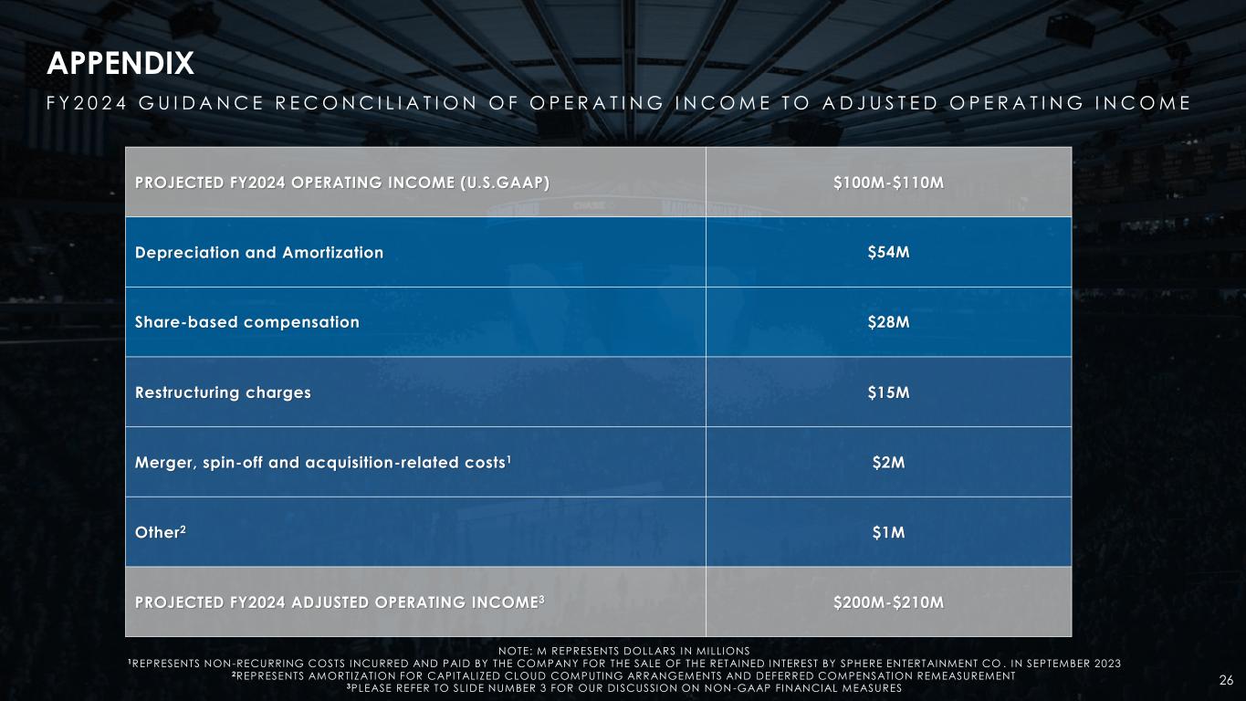 26 PROJECTED FY2024 OPERATING INCOME (U.S.GAAP) $100M-$110M Depreciation and Amortization $54M Share-based compensation $28M Restructuring charges $15M Merger, spin-off and acquisition-related costs1 $2M Other2 $1M PROJECTED FY2024 ADJUSTED OPERATING INCOME3 $200M-$210M APPENDIX F Y 2 0 2 4 G U I D A N C E R E C O N C I L I A T I O N O F O P E R A T I N G I N C O M E T O A D J U S T E D O P E R A T I N G I N C O M E NOTE: M REPRESENTS DOLLARS IN MILLIONS 1REPRESENTS NON-RECURRING COSTS INCURRED AND PAID BY THE COMPANY FOR THE SALE OF THE RETAINED INTEREST BY SPHERE ENTERTAINMENT CO . IN SEPTEMBER 2023 2REPRESENTS AMORTIZATION FOR CAPI TALIZED CLOUD COMPUTING ARRANGEMENTS AND DEFERRED COMPENSATION REMEASUREMENT 3PLEASE REFER TO SLIDE NUMBER 3 FOR OUR DISCUSSION ON NON -GAAP FINANCIAL MEASURES
