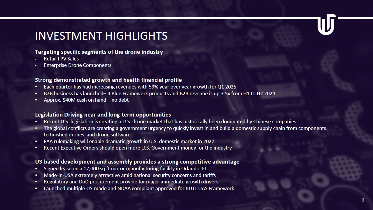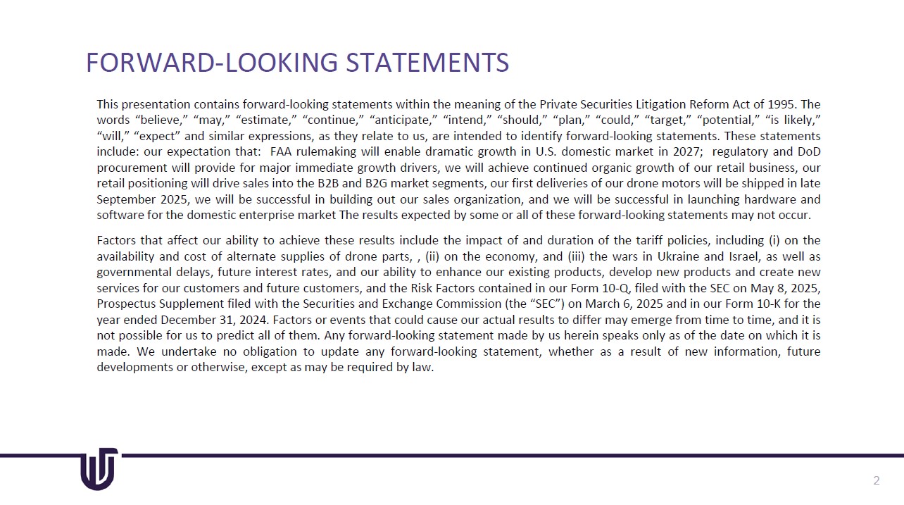 FORWARD - LOOKING STATEMENTS 2 This presentation contains forward - looking statements within the meaning of the Private Securities Litigation Reform Act of 1995 . The words “believe,” “may,” “estimate,” “continue,” “anticipate,” “intend,” “should,” “plan,” “could,” “target,” “potential,” “is likely,” “will,” “expect” and similar expressions, as they relate to us, are intended to identify forward - looking statements . These statements include : our expectation that : FAA rulemaking will enable dramatic growth in U . S . domestic market in 2027 ; regulatory and DoD procurement will provide for major immediate growth drivers, we will achieve continued organic growth of our retail business, our retail positioning will drive sales into the B 2 B and B 2 G market segments, our first deliveries of our drone motors will be shipped in late September 2025 , we will be successful in building out our sales organization, and we will be successful in launching hardware and software for the domestic enterprise market The results expected by some or all of these forward - looking statements may not occur . Factors that affect our ability to achieve these results include the impact of and duration of the tariff policies, including (i) on the availability and cost of alternate supplies of drone parts, , (ii) on the economy, and (iii) the wars in Ukraine and Israel, as well as governmental delays, future interest rates, and our ability to enhance our existing products, develop new products and create new services for our customers and future customers, and the Risk Factors contained in our Form 10 - Q, filed with the SEC on May 8 , 2025 , Prospectus Supplement filed with the Securities and Exchange Commission (the “SEC”) on March 6 , 2025 and in our Form 10 - K for the year ended December 31 , 2024 . Factors or events that could cause our actual results to differ may emerge from time to time, and it is not possible for us to predict all of them . Any forward - looking statement made by us herein speaks only as of the date on which it is made . We undertake no obligation to update any forward - looking statement, whether as a result of new information, future developments or otherwise, except as may be required by law .