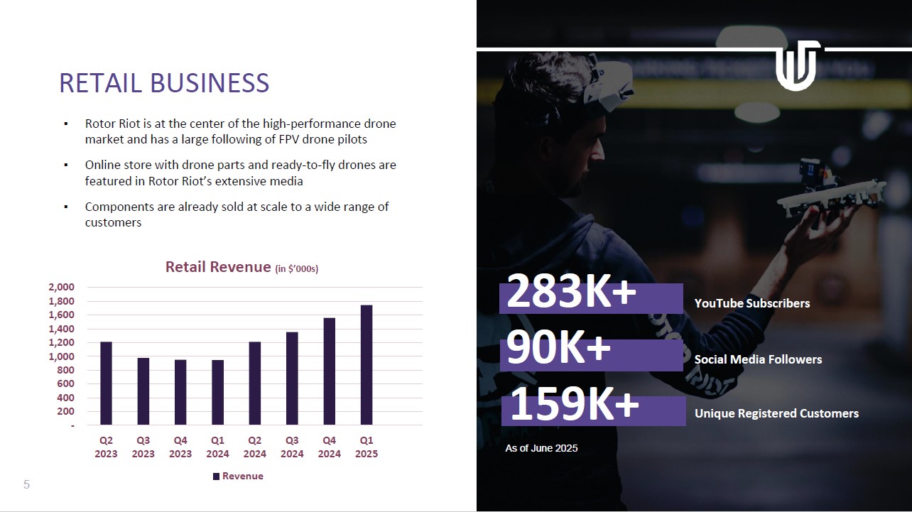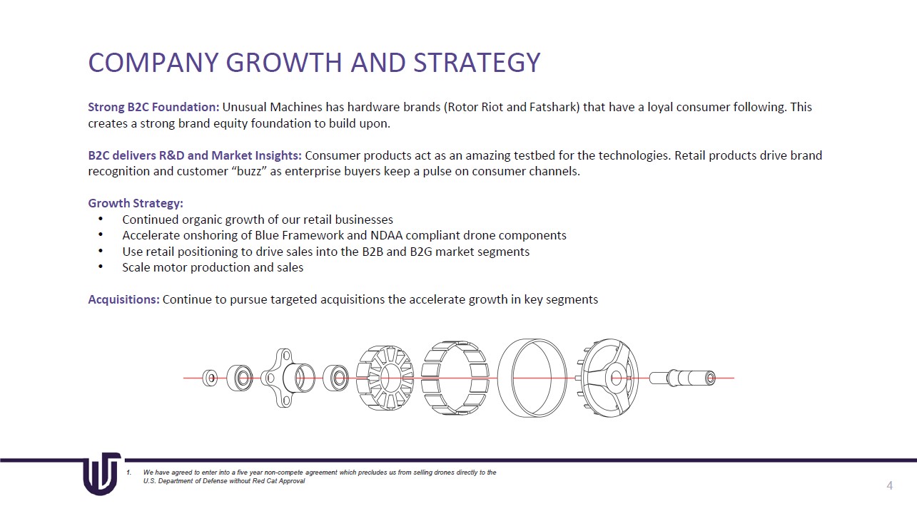 4 Strong B2C Foundation: Unusual Machines has hardware brands (Rotor Riot and Fatshark) that have a loyal consumer following. This creates a strong brand equity foundation to build upon. B2C delivers R&D and Market Insights: Consumer products act as an amazing testbed for the technologies. Retail products drive brand recognition and customer “buzz” as enterprise buyers keep a pulse on consumer channels. Growth Strategy: • Continued organic growth of our retail businesses • Accelerate onshoring of Blue Framework and NDAA compliant drone components • Use retail positioning to drive sales into the B2B and B2G market segments • Scale motor production and sales Acquisitions: Continue to pursue targeted acquisitions the accelerate growth in key segments COMPANY GROWTH AND STRATEGY 1. We have agreed to enter into a five year non - compete agreement which precludes us from selling drones directly to the U.S. Department of Defense without Red Cat Approval