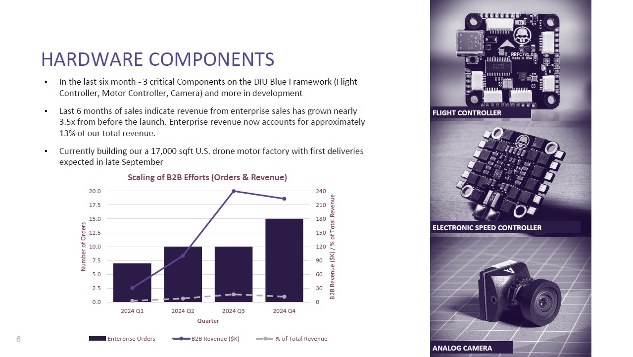 5 90K+ 283K+ 159K+ YouTube Subscribers Unique Registered Customers Social Media Followers ▪ Rotor Riot is at the center of the high - performance drone market and has a large following of FPV drone pilots ▪ Online store with drone parts and ready - to - fly drones are featured in Rotor Riot’s extensive media ▪ Components are already sold at scale to a wide range of customers RETAIL BUSINESS - 2,000 1,800 1,600 1,400 1,200 1,000 800 600 400 200 Q2 Q3 Q4 Q1 Q2 Q3 Q4 Q1 2023 2023 2023 2024 2024 2024 2024 2025 Retail Revenue (in $’000s) Revenue As of June 2025