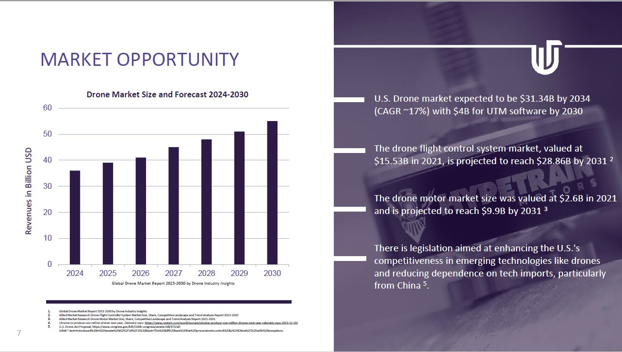 7 0 2024 2030 Drone Market Size and Forecast 2024 - 2030 60 50 40 30 20 10 Revenues in Billion USD 2025 2026 2027 2028 2029 Global Drone Market Report 2023 - 2030 by Drone Industry Insights U.S. Drone market expected to be $31.34B by 2034 (CAGR ~17%) with $4B for UTM software by 2030 The drone flight control system market, valued at $15.53B in 2021, is projected to reach $28.86B by 2031 2 The drone motor market size was valued at $2.6B in 2021 and is projected to reach $9.9B by 2031 3 There is legislation aimed at enhancing the U.S.'s competitiveness in emerging technologies like drones and reducing dependence on tech imports, particularly from China 5 . 1. 2. 3. 4. 5. Global Drone Market Report 2023 - 2030 by Drone Industry Insights Allied Market Research Drone Flight Controller System Market Size, Share, Competitive Landscape and Trend Analysis Report 2023 - 2032 Allied Market Research Drone Motor Market Size, Share, Competitive Landscape and Trend Analysis Report 2021 - 2031 Ukraine to produce one million drones next year, Zelenskiy says : https://www.reuters.com/world/europe/ukraine - produce - one - million - drones - next - year - zelenskiy - says - 2023 - 12 - 19/ U.S. Drone Act Proposal: https:// www.congress.gov/bill/118th - congress/senate - bill/473/all - info#:~:text=Introduced%20in%20Senate%20(02%2F16%2F2023)&text=This%20bill%20bans%20the%20procurement,control%20by%20China%2C% 20w ith%20exceptions. MARKET OPPORTUNITY