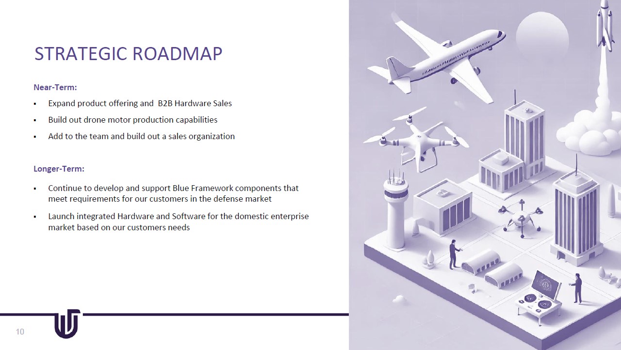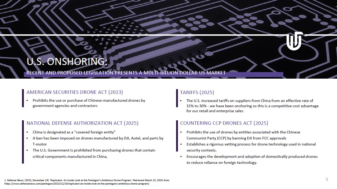 AMERICAN SECURITIES DRONE ACT (2023) ▪ Prohibits the use or purchase of Chinese - manufactured drones by government agencies and contractors NATIONAL DEFENSE AUTHORIZATION ACT (2025) ▪ China is designated as a "covered foreign entity" ▪ A ban has been imposed on drones manufactured by DJI, Autel, and parts by T - motor ▪ The U.S. Government is prohibited from purchasing drones that contain critical components manufactured in China, ▪ The U.S. increased tariffs on suppliers from China from an effective rate of 15% to 30% - we have been onshoring so this is a competitive cost advantage for our retail and enterprise sales COUNTERING CCP DRONES ACT (2025) ▪ Prohibits the use of drones by entities associated with the Chinese Communist Party (CCP) by banning DJI from FCC approvals ▪ Establishes a rigorous vetting process for drone technology used in national security contexts. ▪ Encourages the development and adoption of domestically produced drones to reduce reliance on foreign technology. 9 TARIFFS (2025) U.S. ONSHORING: RECENT AND PROPOSED LEGISLATION PRESENTS A MULTI - BILLION DOLLAR US MARKET 1. Defense News. (2023, December 19). 'Replicator: An Inside Look at the Pentagon's Ambitious Drone Program.' Retrieved March 15, 2024, from https:// www.defensenews.com/pentagon/2023/12/19/replicator - an - inside - look - at - the - pentagons - ambitious - drone - program/