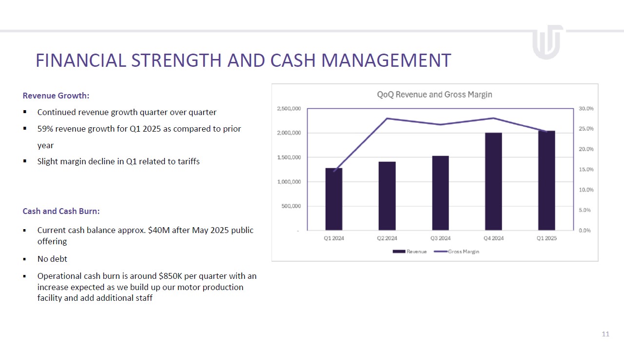 FINANCIAL STRENGTH AND CASH MANAGEMENT 11 Revenue Growth: ▪ Continued revenue growth quarter over quarter ▪ 59% revenue growth for Q1 2025 as compared to prior year ▪ Slight margin decline in Q1 related to tariffs Cash and Cash Burn: ▪ Current cash balance approx. $40M after May 2025 public offering ▪ No debt ▪ Operational cash burn is around $850K per quarter with an increase expected as we build up our motor production facility and add additional staff