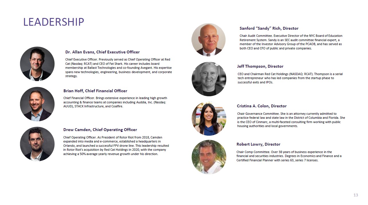 Dr. Allan Evans, Chief Executive Officer Chief Executive Officer. Previously served as Chief Operating Officer at Red Cat (Nasdaq: RCAT) and CEO of Fat Shark. His career includes board membership at Ballast Technologies and co - founding Avegant. His expertise spans new technologies, engineering, business development, and corporate strategy. Brian Hoff, Chief Financial Officer Chief Financial Officer . Brings extensive experience in leading high growth accounting & finance teams at companies including Auddia, Inc . (Nasdaq : AUUD), STACK Infrastructure, and Coalfire . Jeff Thompson, Director CEO and Chairman Red Cat Holdings (NASDAQ: RCAT). Thompson is a serial tech entrepreneur who has led companies from the startup phase to successful exits and IPOs. Cristina A. Colon, Director Chair Governance Committee. She is an attorney currently admitted to practice federal law and state law in the District of Columbia and Florida. She is the CEO of Cinmarc, a multi - faceted consulting firm working with public housing authorities and local governments. Robert Lowry, Director Chair Comp Committee. Over 38 years of business experience in the financial and securities industries. Degrees in Economics and Finance and a Certified Financial Planner with series 63, series 7 licenses. Sanford “Sandy” Rich, Director Chair Audit Committee. Executive Director of the NYC Board of Education Retirement System. Sandy is an SEC audit committee financial expert, a member of the Investor Advisory Group of the PCAOB, and has served as both CEO and CFO of public and private companies. Drew Camden, Chief Operating Officer Chief Operating Officer. As President of Rotor Riot from 2018, Camden expanded into media and e - commerce, established a headquarters in Orlando, and launched a successful FPV drone line. This leadership resulted in Rotor Riot's acquisition by Red Cat Holdings in 2020, with the company achieving a 50% average yearly revenue growth under his direction. LEADERSHIP 13