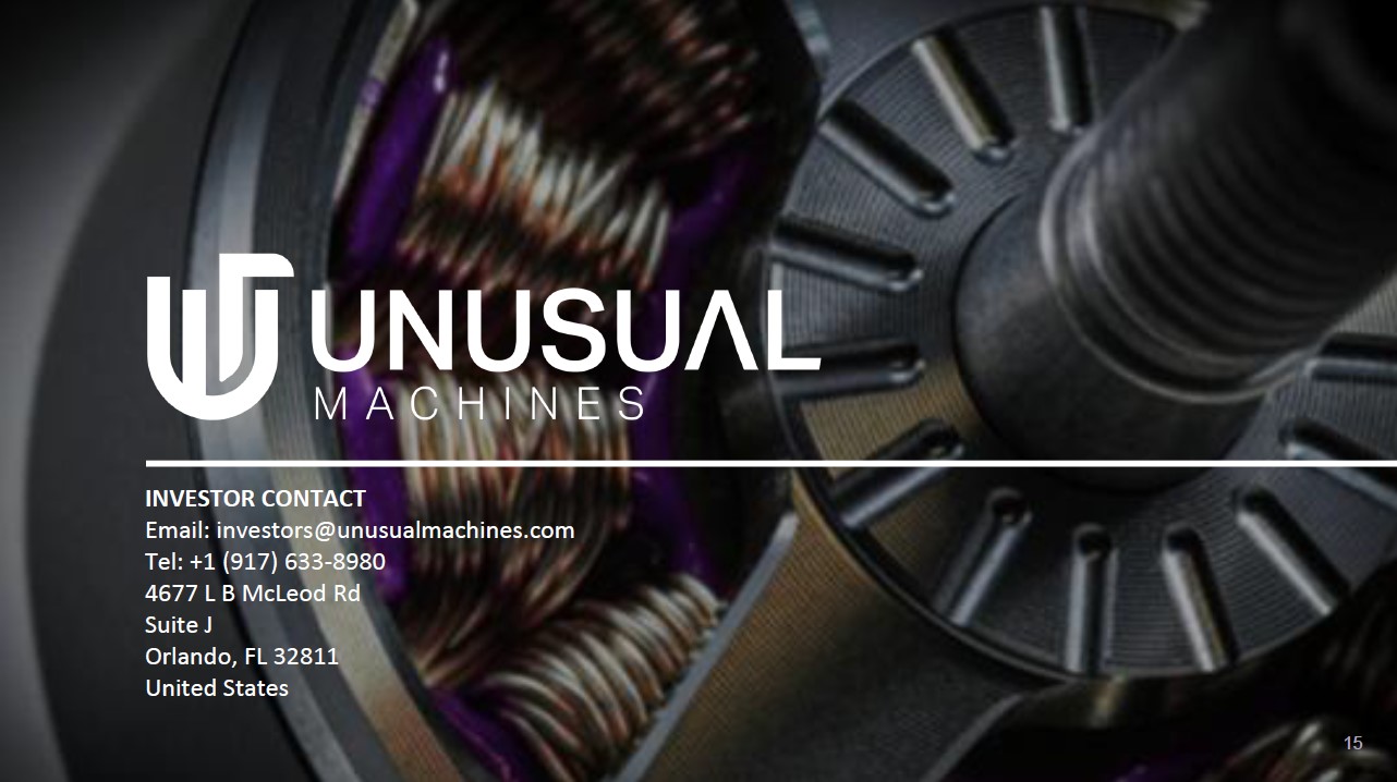 15 INVESTOR CONTACT Email: investors@unusualmachines.com Tel: +1 (917) 633 - 8980 4677 L B McLeod Rd Suite J Orlando, FL 32811 United States