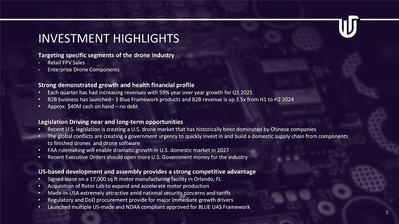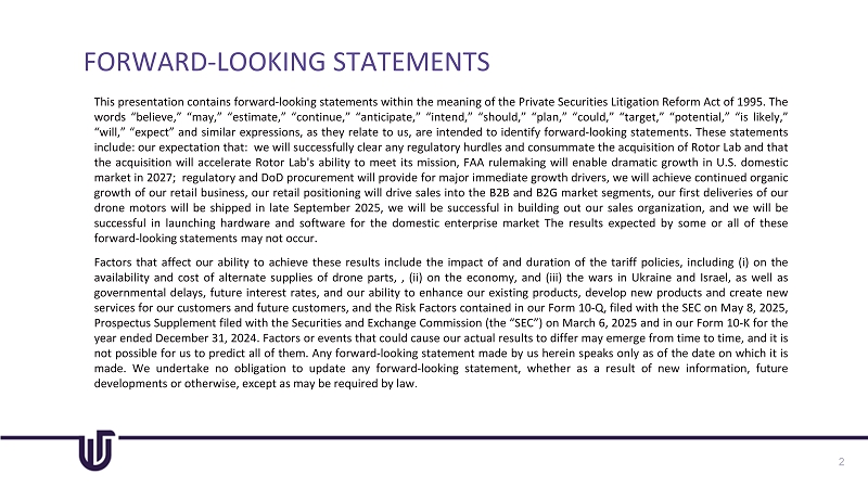 FORWARD - LOOKING STATEMENTS 2 This presentation contains forward - looking statements within the meaning of the Private Securities Litigation Reform Act of 1995 . The words “believe,” “may,” “estimate,” “continue,” “anticipate,” “intend,” “should,” “plan,” “could,” “target,” “potential,” “is likely,” “will,” “expect” and similar expressions, as they relate to us, are intended to identify forward - looking statements . These statements include : our expectation that : we will successfully clear any regulatory hurdles and consummate the acquisition of Rotor Lab and that the acquisition will accelerate Rotor Lab's ability to meet its mission, FAA rulemaking will enable dramatic growth in U . S . domestic market in 2027 ; regulatory and DoD procurement will provide for major immediate growth drivers, we will achieve continued organic growth of our retail business, our retail positioning will drive sales into the B 2 B and B 2 G market segments, our first deliveries of our drone motors will be shipped in late September 2025 , we will be successful in building out our sales organization, and we will be successful in launching hardware and software for the domestic enterprise market The results expected by some or all of these forward - looking statements may not occur . Factors that affect our ability to achieve these results include the impact of and duration of the tariff policies, including ( i ) on the availability and cost of alternate supplies of drone parts, , (ii) on the economy, and (iii) the wars in Ukraine and Israel, as well as governmental delays, future interest rates, and our ability to enhance our existing products, develop new products and create new services for our customers and future customers, and the Risk Factors contained in our Form 10 - Q, filed with the SEC on May 8 , 2025 , Prospectus Supplement filed with the Securities and Exchange Commission (the “SEC”) on March 6 , 2025 and in our Form 10 - K for the year ended December 31 , 2024 . Factors or events that could cause our actual results to differ may emerge from time to time, and it is not possible for us to predict all of them . Any forward - looking statement made by us herein speaks only as of the date on which it is made . We undertake no obligation to update any forward - looking statement, whether as a result of new information, future developments or otherwise, except as may be required by law .