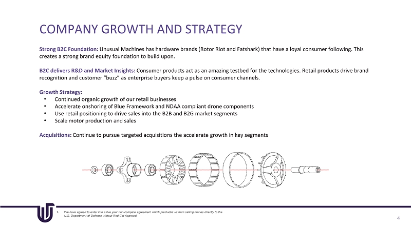 INVESTMENT HIGHLIGHTS 3 Drone Industry Insights estimates that the global drone market is expected to grow from $26.3 billion in 2021 to $41.3 billion by 2026. Flight controller market (stats in red) Drone motor market (stats in red) According to Forbes, Ukraine expects to manufacture more than one million drones in 2024 alone There is legislation aimed at enhancing the U.S.'s competitiveness in emerging technologies like drones and reducing dependence on tech imports, particularly from China. Targeting specific segments of the drone industry • Retail FPV Sales • Enterprise Drone Components Strong demonstrated growth and health financial profile • Each quarter has had increasing revenues with 59% year over year growth for Q1 2025 • B2B business has launched – 3 Blue Framework products and B2B revenue is up 3.5x from H1 to H2 2024 • Approx. $40M cash on hand – no debt Legislation Driving near and long - term opportunities • Recent U.S. legislation is creating a U.S. drone market that has historically been dominated by Chinese companies • The global conflicts are creating a government urgency to quickly invest in and build a domestic supply chain from components to finished drones and drone software • FAA rulemaking will enable dramatic growth in U.S. domestic market in 2027 • Recent Executive Orders should open more U.S. Government money for the industry US - based development and assembly provides a strong competitive advantage • Signed lease on a 17,000 sq ft motor manufacturing facility in Orlando, FL • Acquisition of Rotor Lab to expand and accelerate motor production • Made - in - USA extremely attractive amid national security concerns and tariffs • Regulatory and DoD procurement provide for major immediate growth drivers • Launched multiple US - made and NDAA compliant approved for BLUE UAS Framework INVESTMENT HIGHLIGHTS 3