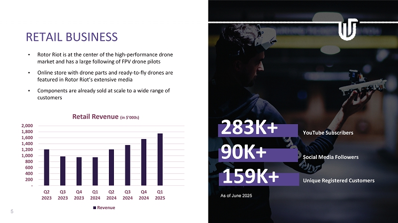4 Strong B2C Foundation: Unusual Machines has hardware brands (Rotor Riot and Fatshark ) that have a loyal consumer following. This creates a strong brand equity foundation to build upon. B2C delivers R&D and Market Insights: Consumer products act as an amazing testbed for the technologies. Retail products drive brand recognition and customer “buzz” as enterprise buyers keep a pulse on consumer channels. Growth Strategy: • Continued organic growth of our retail businesses • Accelerate onshoring of Blue Framework and NDAA compliant drone components • Use retail positioning to drive sales into the B2B and B2G market segments • Scale motor production and sales Acquisitions: Continue to pursue targeted acquisitions the accelerate growth in key segments COMPANY GROWTH AND STRATEGY 1. We have agreed to enter into a five year non - compete agreement which precludes us from selling drones directly to the U.S. Department of Defense without Red Cat Approval