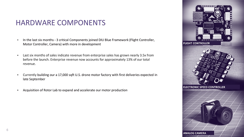 5 90K+ 283K+ 159K+ YouTube Subscribers Unique Registered Customers Social Media Followers ▪ Rotor Riot is at the center of the high - performance drone market and has a large following of FPV drone pilots ▪ Online store with drone parts and ready - to - fly drones are featured in Rotor Riot’s extensive media ▪ Components are already sold at scale to a wide range of customers RETAIL BUSINESS - 200 400 600 800 1,000 1,200 1,400 1,600 1,800 2,000 Q2 2023 Q3 2023 Q4 2023 Q1 2024 Q2 2024 Q3 2024 Q4 2024 Q1 2025 Retail Revenue (in $’000s) Revenue As of June 2025