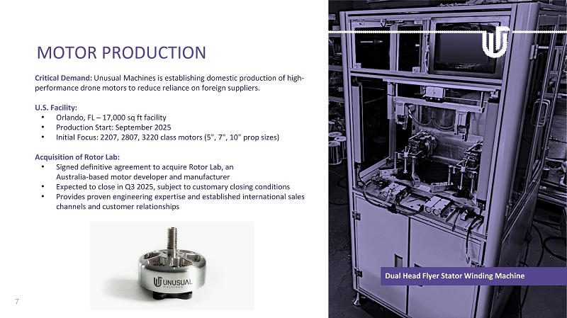 7 MOTOR PRODUCTION Critical Demand: Unusual Machines is establishing domestic production of high - performance drone motors to reduce reliance on foreign suppliers. U.S. Facility: • Orlando, FL – 17,000 sq ft facility • Production Start: September 2025 • Initial Focus: 2207, 2807, 3220 class motors (5", 7", 10" prop sizes) Acquisition of Rotor Lab: • Signed definitive agreement to acquire Rotor Lab, an Australia - based motor developer and manufacturer • Expected to close in Q3 2025, subject to customary closing conditions • Provides proven engineering expertise and established international sales channels and customer relationships Dual Head Flyer Stator Winding Machine