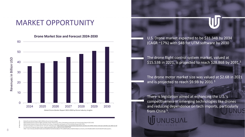 8 0 10 20 30 40 50 60 2024 2025 2026 2027 2028 2029 2030 Drone Market Size and Forecast 2024 - 2030 Revenues in Billion USD Global Drone Market Report 2023 - 2030 by Drone Industry Insights U.S. Drone market expected to be $31.34B by 2034 (CAGR ~17%) with $4B for UTM software by 2030 The drone flight control system market, valued at $15.53B in 2021, is projected to reach $28.86B by 2031 2 The drone motor market size was valued at $2.6B in 2021 and is projected to reach $9.9B by 2031 3 There is legislation aimed at enhancing the U.S.'s competitiveness in emerging technologies like drones and reducing dependence on tech imports, particularly from China 5 . 1. Global Drone Market Report 2023 - 2030 by Drone Industry Insights 2. Allied Market Research Drone Flight Controller System Market Size, Share, Competitive Landscape and Trend Analysis Report 202 3 - 2 032 3. Allied Market Research Drone Motor Market Size, Share, Competitive Landscape and Trend Analysis Report 2021 - 2031 4. Ukraine to produce one million drones next year, Zelenskiy says : https://www.reuters.com/world/europe/ukraine - produce - one - million - drones - next - year - zelenskiy - says - 2023 - 12 - 19/ 5. U.S. Drone Act Proposal: https://www.congress.gov/bill/118th - congress/senate - bill/473/all - info#:~:text=Introduced%20in%20Senate%20(02%2F16%2F2023)&text=This%20bill%20bans%20the%20procurement,control%20by%20China%2C% 20w ith%20exceptions. MARKET OPPORTUNITY