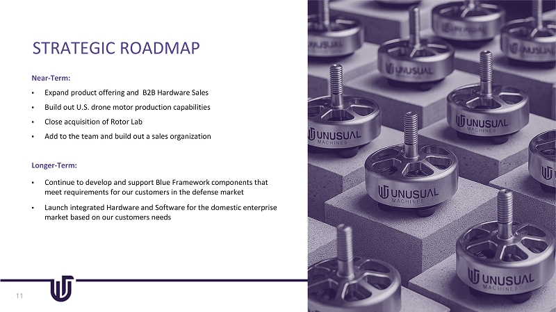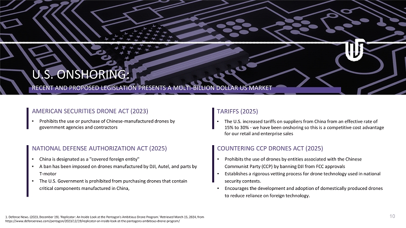AMERICAN SECURITIES DRONE ACT (2023) ▪ Prohibits the use or purchase of Chinese - manufactured drones by government agencies and contractors ▪ The U.S. increased tariffs on suppliers from China from an effective rate of 15% to 30% - we have been onshoring so this is a competitive cost advantage for our retail and enterprise sales TARIFFS (2025) ▪ China is designated as a "covered foreign entity" ▪ A ban has been imposed on drones manufactured by DJI, Autel , and parts by T - motor ▪ The U.S. Government is prohibited from purchasing drones that contain critical components manufactured in China, ▪ Prohibits the use of drones by entities associated with the Chinese Communist Party (CCP) by banning DJI from FCC approvals ▪ Establishes a rigorous vetting process for drone technology used in national security contexts. ▪ Encourages the development and adoption of domestically produced drones to reduce reliance on foreign technology. COUNTERING CCP DRONES ACT (2025) NATIONAL DEFENSE AUTHORIZATION ACT (2025) 10 U.S. ONSHORING: 1. Defense News. (2023, December 19). 'Replicator: An Inside Look at the Pentagon's Ambitious Drone Program.' Retrieved March 15 , 2024, from https:// www.defensenews.com /pentagon/2023/12/19/replicator - an - inside - look - at - the - pentagons - ambitious - drone - program/ RECENT AND PROPOSED LEGISLATION PRESENTS A MULTI - BILLION DOLLAR US MARKET