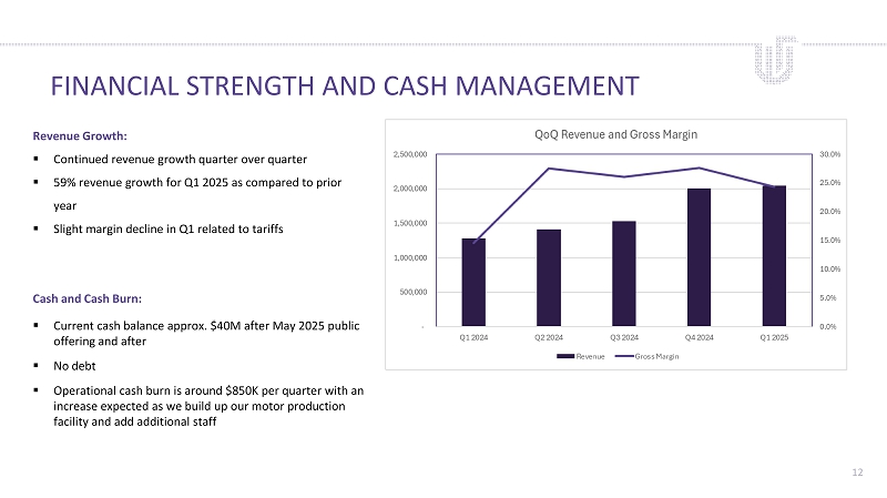 STRATEGIC ROADMAP Near - Term: ▪ Expand product offering and B2B Hardware Sales ▪ Build out U.S. drone motor production capabilities ▪ Close acquisition of Rotor Lab ▪ Add to the team and build out a sales organization Longer - Term: ▪ Continue to develop and support Blue Framework components that meet requirements for our customers in the defense market ▪ Launch integrated Hardware and Software for the domestic enterprise market based on our customers needs 11
