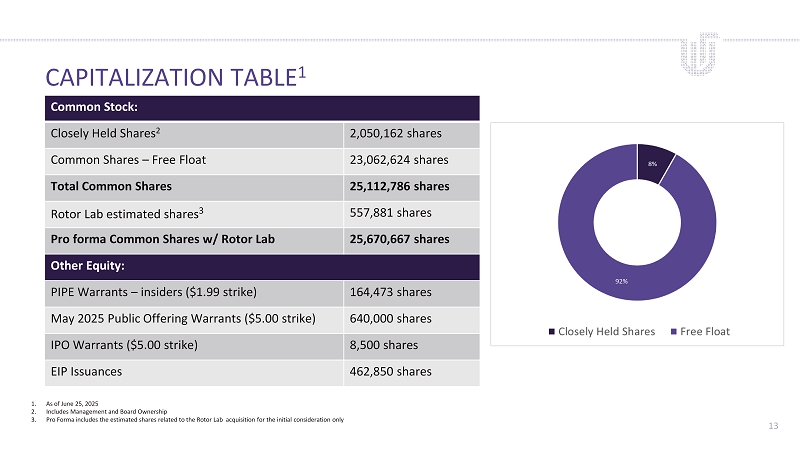 FINANCIAL STRENGTH AND CASH MANAGEMENT 12 Revenue Growth: ▪ Continued revenue growth quarter over quarter ▪ 59% revenue growth for Q1 2025 as compared to prior year ▪ Slight margin decline in Q1 related to tariffs Cash and Cash Burn: ▪ Current cash balance approx. $40M after May 2025 public offering and after ▪ No debt ▪ Operational cash burn is around $850K per quarter with an increase expected as we build up our motor production facility and add additional staff