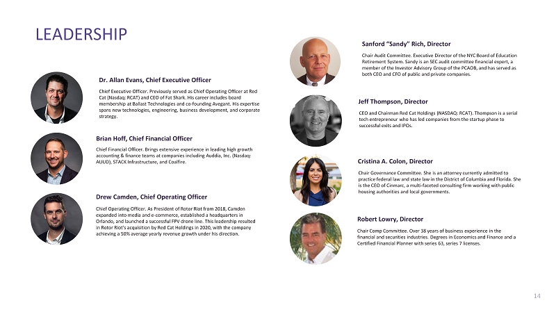 Dr. Allan Evans, Chief Executive Officer Chief Executive Officer. Previously served as Chief Operating Officer at Red Cat (Nasdaq: RCAT) and CEO of Fat Shark. His career includes board membership at Ballast Technologies and co - founding Avegant . His expertise spans new technologies, engineering, business development, and corporate strategy. CEO and Chairman Red Cat Holdings (NASDAQ: RCAT). Thompson is a serial tech entrepreneur who has led companies from the startup phase to successful exits and IPOs. Chair Governance Committee. She is an attorney currently admitted to practice federal law and state law in the District of Columbia and Florida. She is the CEO of Cinmarc , a multi - faceted consulting firm working with public housing authorities and local governments. Chair Comp Committee. Over 38 years of business experience in the financial and securities industries. Degrees in Economics and Finance and a Certified Financial Planner with series 63, series 7 licenses. Chair Audit Committee. Executive Director of the NYC Board of Education Retirement System. Sandy is an SEC audit committee financial expert, a member of the Investor Advisory Group of the PCAOB, and has served as both CEO and CFO of public and private companies. Chief Financial Officer. Brings extensive experience in leading high growth accounting & finance teams at companies including Auddia , Inc. (Nasdaq: AUUD), STACK Infrastructure, and Coalfire. Chief Operating Officer. As President of Rotor Riot from 2018, Camden expanded into media and e - commerce, established a headquarters in Orlando, and launched a successful FPV drone line. This leadership resulted in Rotor Riot's acquisition by Red Cat Holdings in 2020, with the company achieving a 50% average yearly revenue growth under his direction. Jeff Thompson, Director LEADERSHIP Cristina A. Colon, Director Robert Lowry, Director Brian Hoff, Chief Financial Officer Drew Camden, Chief Operating Officer Sanford “Sandy” Rich, Director 14