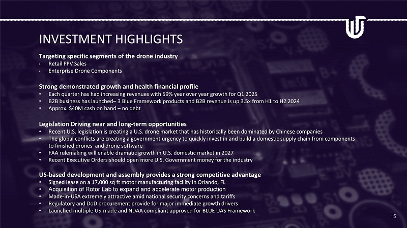 INVESTMENT HIGHLIGHTS 15 Drone Industry Insights estimates that the global drone market is expected to grow from $26.3 billion in 2021 to $41.3 billion by 2026. Flight controller market (stats in red) Drone motor market (stats in red) According to Forbes, Ukraine expects to manufacture more than one million drones in 2024 alone There is legislation aimed at enhancing the U.S.'s competitiveness in emerging technologies like drones and reducing dependence on tech imports, particularly from China. Targeting specific segments of the drone industry • Retail FPV Sales • Enterprise Drone Components Strong demonstrated growth and health financial profile • Each quarter has had increasing revenues with 59% year over year growth for Q1 2025 • B2B business has launched – 3 Blue Framework products and B2B revenue is up 3.5x from H1 to H2 2024 • Approx. $40M cash on hand – no debt Legislation Driving near and long - term opportunities • Recent U.S. legislation is creating a U.S. drone market that has historically been dominated by Chinese companies • The global conflicts are creating a government urgency to quickly invest in and build a domestic supply chain from components to finished drones and drone software • FAA rulemaking will enable dramatic growth in U.S. domestic market in 2027 • Recent Executive Orders should open more U.S. Government money for the industry US - based development and assembly provides a strong competitive advantage • Signed lease on a 17,000 sq ft motor manufacturing facility in Orlando, FL • Acquisition of Rotor Lab to expand and accelerate motor production • Made - in - USA extremely attractive amid national security concerns and tariffs • Regulatory and DoD procurement provide for major immediate growth drivers • Launched multiple US - made and NDAA compliant approved for BLUE UAS Framework INVESTMENT HIGHLIGHTS 15