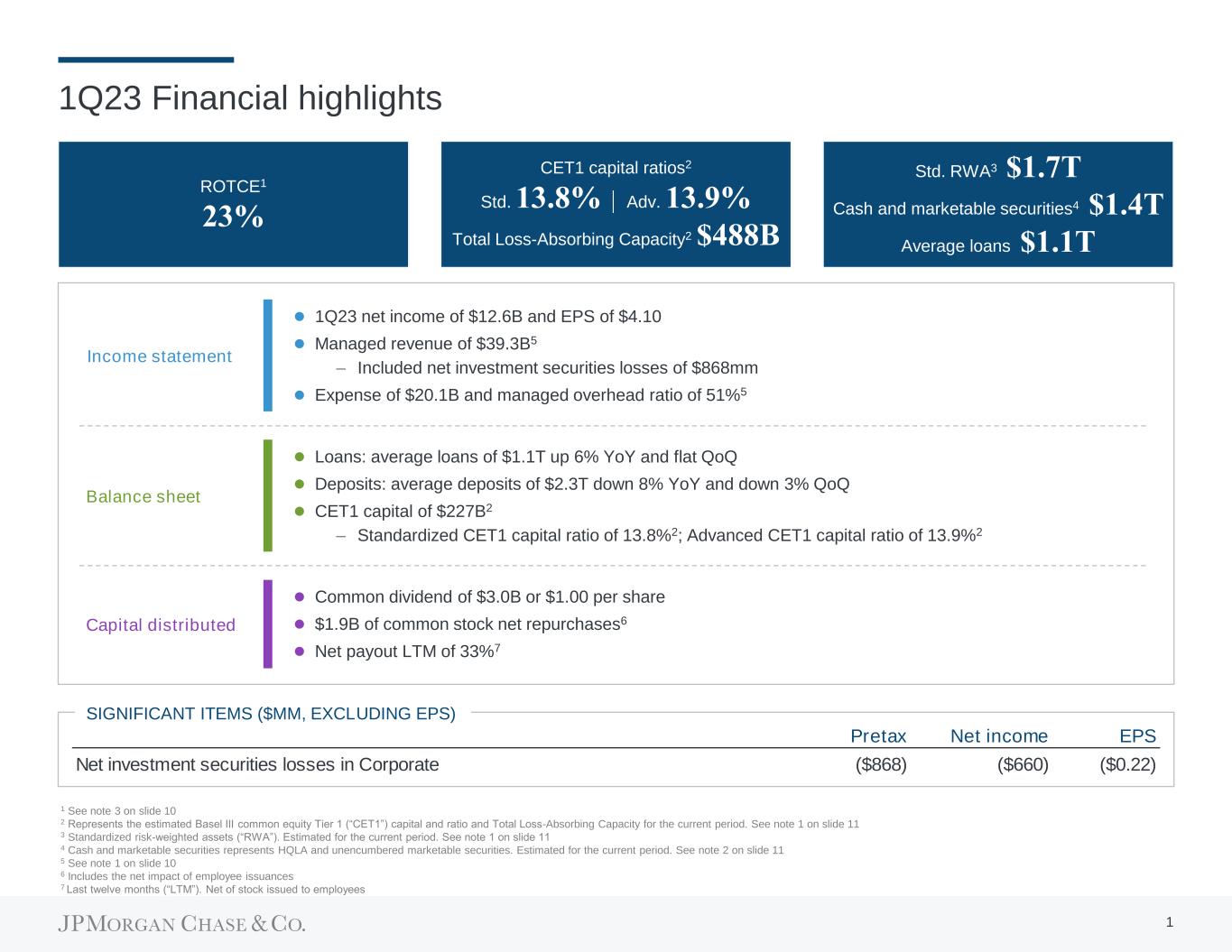 1Q23 Financial highlights 1 See note 3 on slide 10 2 Represents the estimated Basel III common equity Tier 1 (“CET1”) capital and ratio and Total Loss-Absorbing Capacity for the current period. See note 1 on slide 11 3 Standardized risk-weighted assets (“RWA”). Estimated for the current period. See note 1 on slide 11 4 Cash and marketable securities represents HQLA and unencumbered marketable securities. Estimated for the current period. See note 2 on slide 11 5 See note 1 on slide 10 6 Includes the net impact of employee issuances 7 Last twelve months (“LTM”). Net of stock issued to employees SIGNIFICANT ITEMS ($MM, EXCLUDING EPS) Pretax Net income EPS Net investment securities losses in Corporate ($868) ($660) ($0.22) Balance sheet ⚫ Loans: average loans of $1.1T up 6% YoY and flat QoQ ⚫ Deposits: average deposits of $2.3T down 8% YoY and down 3% QoQ ⚫ CET1 capital of $227B2 – Standardized CET1 capital ratio of 13.8%2; Advanced CET1 capital ratio of 13.9%2 Capital distributed ⚫ Common dividend of $3.0B or $1.00 per share ⚫ $1.9B of common stock net repurchases6 ⚫ Net payout LTM of 33%7 Income statement ⚫ 1Q23 net income of $12.6B and EPS of $4.10 ⚫ Managed revenue of $39.3B5 – Included net investment securities losses of $868mm ⚫ Expense of $20.1B and managed overhead ratio of 51%5 ROTCE1 23% CET1 capital ratios2 Std. 13.8% | Adv. 13.9% Total Loss-Absorbing Capacity2 $488B Std. RWA3 $1.7T Cash and marketable securities4 $1.4T Average loans $1.1T 1