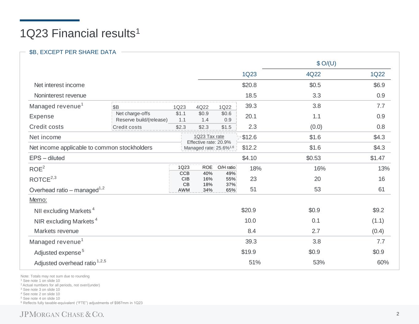 1Q23 4Q22 1Q22 Net interest income $20.8 $0.5 $6.9 Noninterest revenue 18.5 3.3 0.9 Managed revenue1 39.3 3.8 7.7 Expense 20.1 1.1 0.9 Credit costs 2.3 (0.0) 0.8 Net income $12.6 $1.6 $4.3 Net income applicable to common stockholders $12.2 $1.6 $4.3 EPS – diluted $4.10 $0.53 $1.47 ROE2 18% 16% 13% ROTCE2,3 23 20 16 Overhead ratio – managed1,2 51 53 61 Memo: NII excluding Markets 4 $20.9 $0.9 $9.2 NIR excluding Markets 4 10.0 0.1 (1.1) Markets revenue 8.4 2.7 (0.4) Managed revenue1 39.3 3.8 7.7 Adjusted expense 5 $19.9 $0.9 $0.9 Adjusted overhead ratio 1,2,5 51% 53% 60% $ O/(U) 1Q23 ROE O/H ratio CCB 40% 49% CIB 16% 55% CB 18% 37% AWM 34% 65% 1Q23 Financial results1 1Q23 Tax rate Effective rate: 20.9% Managed rate: 25.6%1,6 Note: Totals may not sum due to rounding 1 See note 1 on slide 10 2 Actual numbers for all periods, not over/(under) 3 See note 3 on slide 10 4 See note 2 on slide 10 5 See note 4 on slide 10 6 Reflects fully taxable-equivalent (“FTE”) adjustments of $987mm in 1Q23 $B 1Q23 4Q22 1Q22 Net charge-offs $1.1 $0.9 $0.6 Reserve build/(release) 1.1 1.4 0.9 Credit costs $2.3 $2.3 $1.5 $B, EXCEPT PER SHARE DATA 2