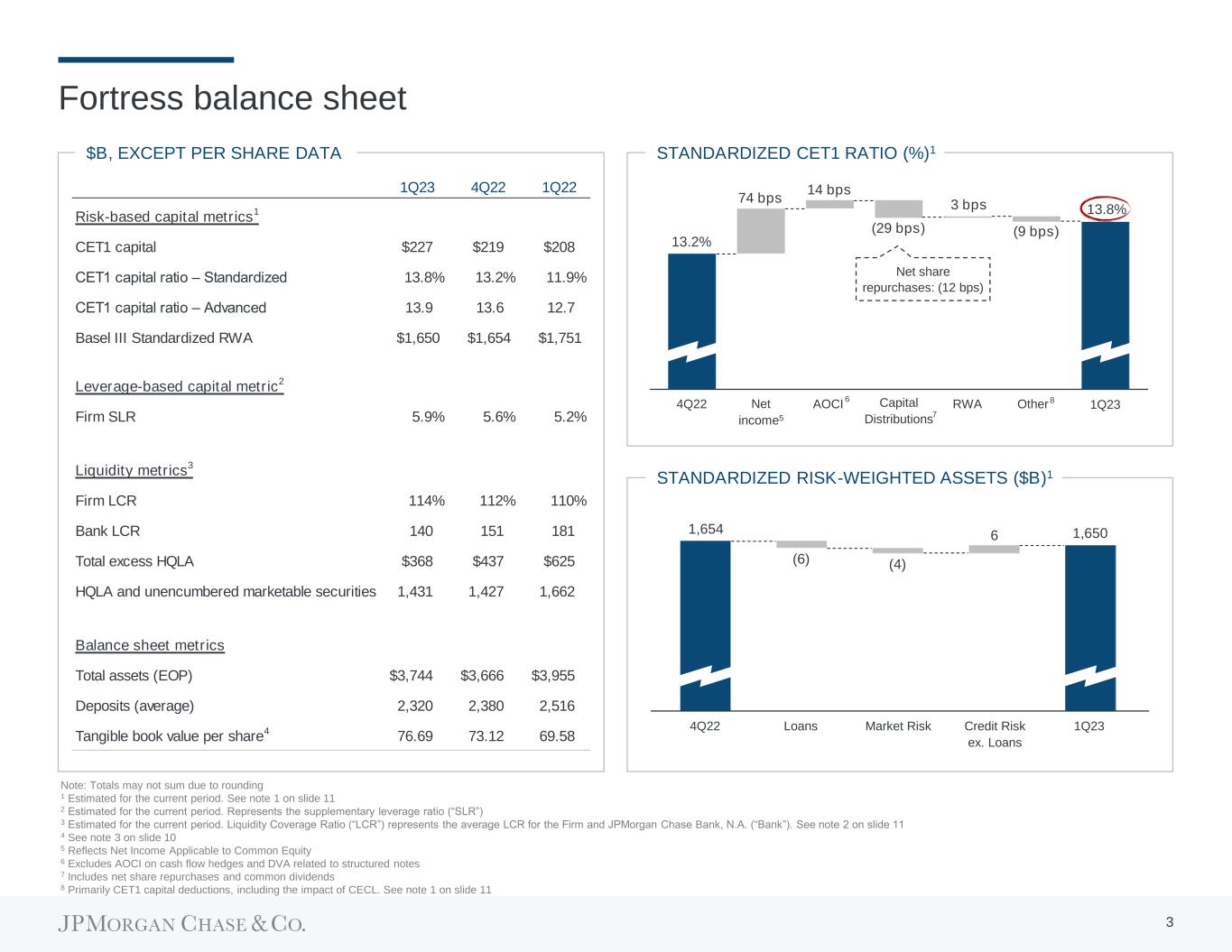 1Q23 4Q22 1Q22 Risk-based capital metrics 1 CET1 capital $227 $219 $208 CET1 capital ratio – Standardized 13.8% 13.2% 11.9% CET1 capital ratio – Advanced 13.9 13.6 12.7 Basel III Standardized RWA $1,650 $1,654 $1,751 Leverage-based capital metric 2 Firm SLR 5.9% 5.6% 5.2% Liquidity metrics 3 Firm LCR 114% 112% 110% Bank LCR 140 151 181 Total excess HQLA $368 $437 $625 HQLA and unencumbered marketable securities 1,431 1,427 1,662 Balance sheet metrics Total assets (EOP) $3,744 $3,666 $3,955 Deposits (average) 2,320 2,380 2,516 Tangible book value per share 4 76.69 73.12 69.58 Fortress balance sheet Note: Totals may not sum due to rounding 1 Estimated for the current period. See note 1 on slide 11 2 Estimated for the current period. Represents the supplementary leverage ratio (“SLR”) 3 Estimated for the current period. Liquidity Coverage Ratio (“LCR”) represents the average LCR for the Firm and JPMorgan Chase Bank, N.A. (“Bank”). See note 2 on slide 11 4 See note 3 on slide 10 5 Reflects Net Income Applicable to Common Equity 6 Excludes AOCI on cash flow hedges and DVA related to structured notes 7 Includes net share repurchases and common dividends 8 Primarily CET1 capital deductions, including the impact of CECL. See note 1 on slide 11 $B, EXCEPT PER SHARE DATA STANDARDIZED CET1 RATIO (%)1 STANDARDIZED RISK-WEIGHTED ASSETS ($B)1 4Q22 Loans Credit Risk ex. Loans Market Risk 1Q23 (4) 1,654 1,650 (6) 6 AOCI Other 6 84Q22 RWA 1Q23Capital Distributions 7 Net income5 13.8% 13.2% Net share repurchases: (12 bps) 74 bps 14 bps (29 bps) 3 bps (9 bps) 3