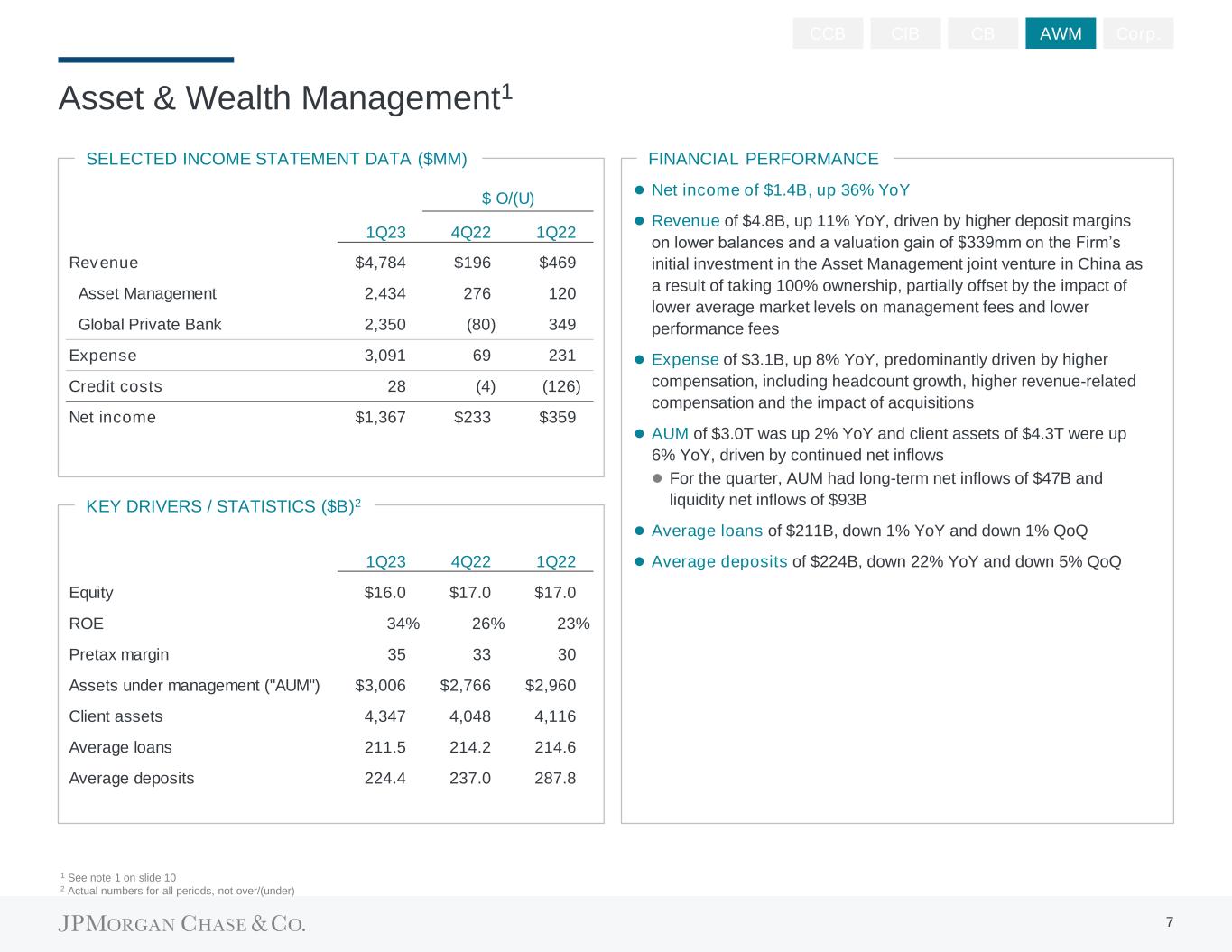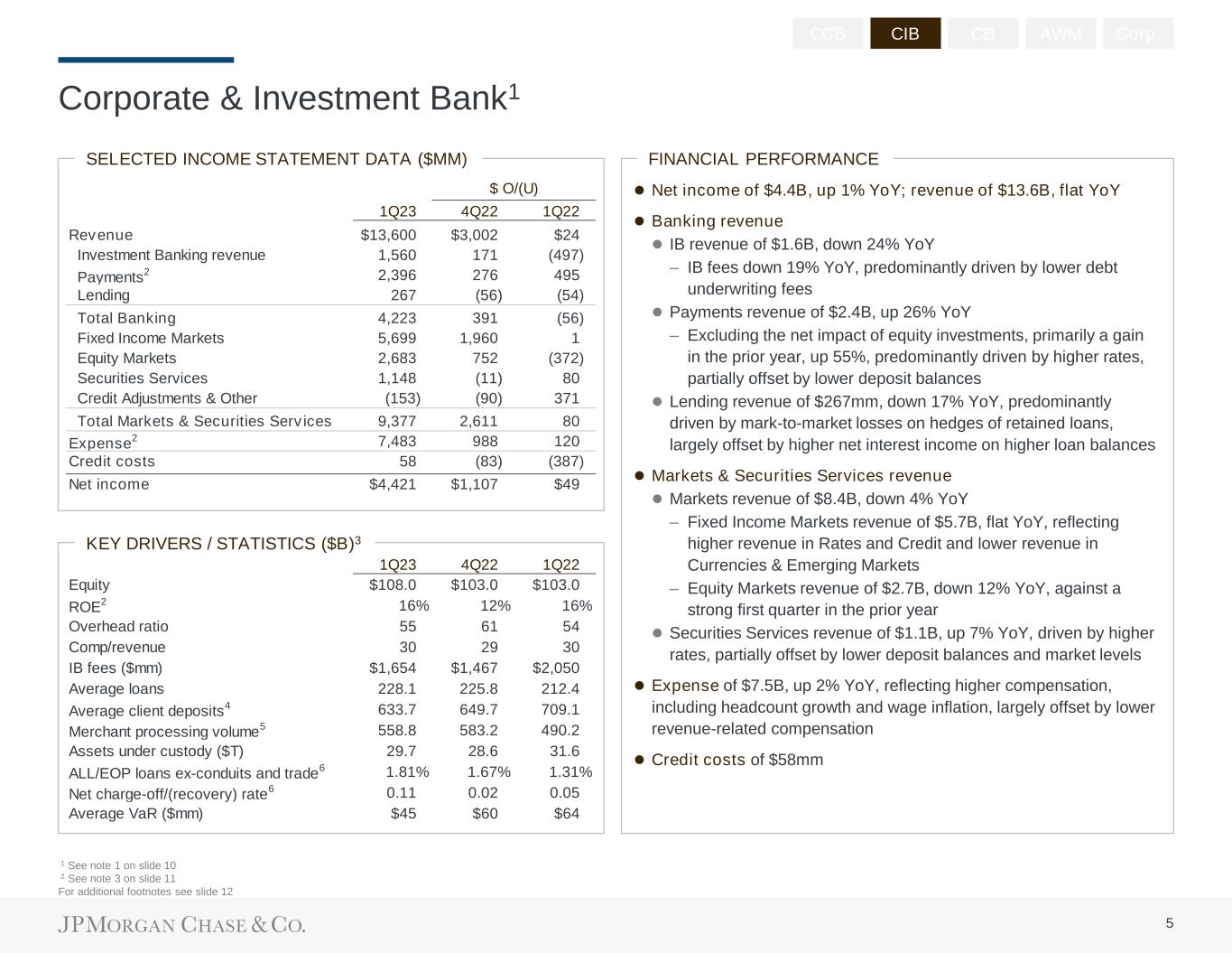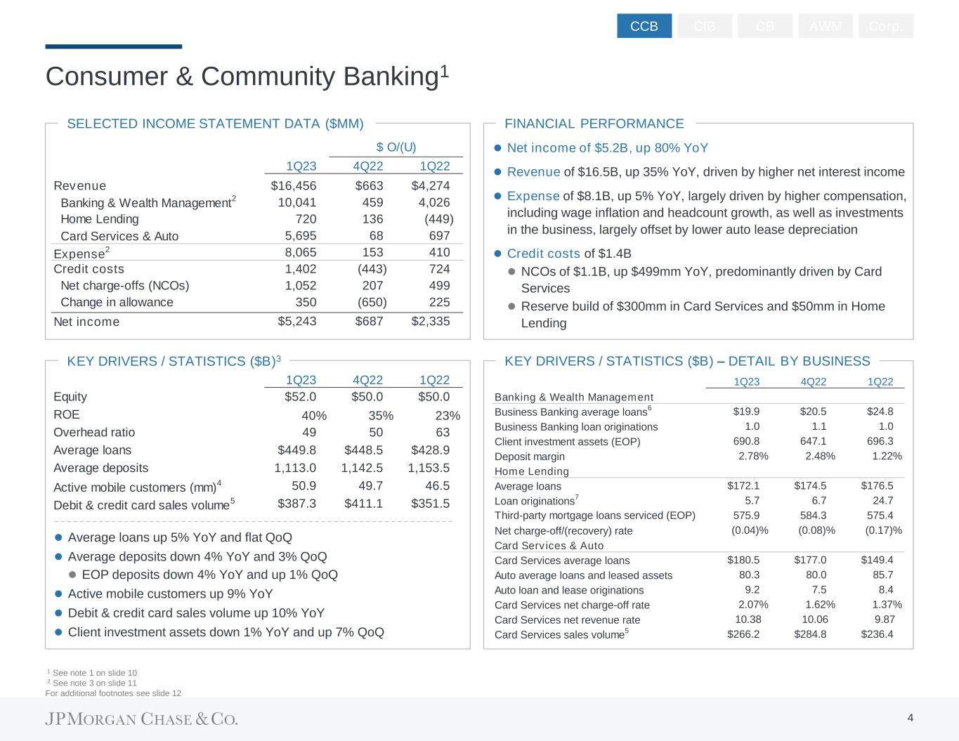 Consumer & Community Banking1 KEY DRIVERS / STATISTICS ($B) – DETAIL BY BUSINESS FINANCIAL PERFORMANCESELECTED INCOME STATEMENT DATA ($MM) KEY DRIVERS / STATISTICS ($B)3 ⚫ Net income of $5.2B, up 80% YoY ⚫ Revenue of $16.5B, up 35% YoY, driven by higher net interest income ⚫ Expense of $8.1B, up 5% YoY, largely driven by higher compensation, including wage inflation and headcount growth, as well as investments in the business, largely offset by lower auto lease depreciation ⚫ Credit costs of $1.4B ⚫ NCOs of $1.1B, up $499mm YoY, predominantly driven by Card Services ⚫ Reserve build of $300mm in Card Services and $50mm in Home Lending 1 See note 1 on slide 10 2 See note 3 on slide 11 For additional footnotes see slide 12 CCB CIB CB AWM Corp. $ O/(U) 1Q23 4Q22 1Q22 Revenue $16,456 $663 $4,274 Banking & Wealth Management 2 10,041 459 4,026 Home Lending 720 136 (449) Card Services & Auto 5,695 68 697 Expense 2 8,065 153 410 Credit costs 1,402 (443) 724 Net charge-offs (NCOs) 1,052 207 499 Change in allowance 350 (650) 225 Net income $5,243 $687 $2,335 1Q23 4Q22 1Q22 Banking & Wealth Management Business Banking average loans 6 $19.9 $20.5 $24.8 Business Banking loan originations 1.0 1.1 1.0 Client investment assets (EOP) 690.8 647.1 696.3 Deposit margin 2.78% 2.48% 1.22% Home Lending Average loans $172.1 $174.5 $176.5 Loan originations 7 5.7 6.7 24.7 Third-party mortgage loans serviced (EOP) 575.9 584.3 575.4 Net charge-off/(recovery) rate (0.04)% (0.08)% (0.17)% Card Services & Auto Card Services average loans $180.5 $177.0 $149.4 Auto average loans and leased assets 80.3 80.0 85.7 Auto loan and lease originations 9.2 7.5 8.4 Card Services net charge-off rate 2.07% 1.62% 1.37% Card Services net revenue rate 10.38 10.06 9.87 Card Services sales volume 5 $266.2 $284.8 $236.4 1Q23 4Q22 1Q22 Equity $52.0 $50.0 $50.0 ROE 40% 35% 23% Overhead ratio 49 50 63 Average loans $449.8 $448.5 $428.9 Average deposits 1,113.0 1,142.5 1,153.5 Active mobile customers (mm) 4 50.9 49.7 46.5 Debit & credit card sales volume 5 $387.3 $411.1 $351.5 ⚫ Average loans up 5% YoY and flat QoQ ⚫ Average deposits down 4% YoY and 3% QoQ ⚫ EOP deposits down 4% YoY and up 1% QoQ ⚫ Active mobile customers up 9% YoY ⚫ Debit & credit card sales volume up 10% YoY ⚫ Client investment assets down 1% YoY and up 7% QoQ 4