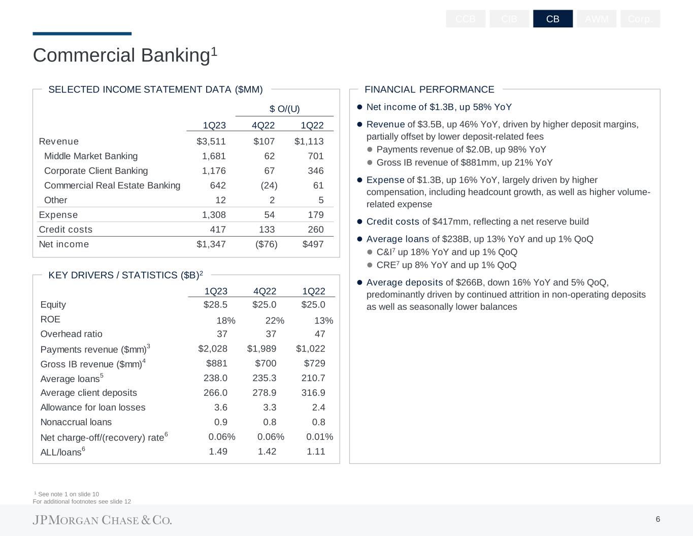 1Q23 4Q22 1Q22 Equity $108.0 $103.0 $103.0 ROE 2 16% 12% 16% Overhead ratio 55 61 54 Comp/revenue 30 29 30 IB fees ($mm) $1,654 $1,467 $2,050 Average loans 228.1 225.8 212.4 Average client deposits 4 633.7 649.7 709.1 Merchant processing volume 5 558.8 583.2 490.2 Assets under custody ($T) 29.7 28.6 31.6 ALL/EOP loans ex-conduits and trade 6 1.81% 1.67% 1.31% Net charge-off/(recovery) rate 6 0.11 0.02 0.05 Average VaR ($mm) $45 $60 $64 $ O/(U) 1Q23 4Q22 1Q22 Revenue $13,600 $3,002 $24 Investment Banking revenue 1,560 171 (497) Payments 2 2,396 276 495 Lending 267 (56) (54) Total Banking 4,223 391 (56) Fixed Income Markets 5,699 1,960 1 Equity Markets 2,683 752 (372) Securities Services 1,148 (11) 80 Credit Adjustments & Other (153) (90) 371 Total Markets & Securities Services 9,377 2,611 80 Expense 2 7,483 988 120 Credit costs 58 (83) (387) Net income $4,421 $1,107 $49 Corporate & Investment Bank1 KEY DRIVERS / STATISTICS ($B)3 ⚫ Net income of $4.4B, up 1% YoY; revenue of $13.6B, flat YoY ⚫ Banking revenue ⚫ IB revenue of $1.6B, down 24% YoY – IB fees down 19% YoY, predominantly driven by lower debt underwriting fees ⚫ Payments revenue of $2.4B, up 26% YoY – Excluding the net impact of equity investments, primarily a gain in the prior year, up 55%, predominantly driven by higher rates, partially offset by lower deposit balances ⚫ Lending revenue of $267mm, down 17% YoY, predominantly driven by mark-to-market losses on hedges of retained loans, largely offset by higher net interest income on higher loan balances ⚫ Markets & Securities Services revenue ⚫ Markets revenue of $8.4B, down 4% YoY – Fixed Income Markets revenue of $5.7B, flat YoY, reflecting higher revenue in Rates and Credit and lower revenue in Currencies & Emerging Markets – Equity Markets revenue of $2.7B, down 12% YoY, against a strong first quarter in the prior year ⚫ Securities Services revenue of $1.1B, up 7% YoY, driven by higher rates, partially offset by lower deposit balances and market levels ⚫ Expense of $7.5B, up 2% YoY, reflecting higher compensation, including headcount growth and wage inflation, largely offset by lower revenue-related compensation ⚫ Credit costs of $58mm 1 See note 1 on slide 10 2 See note 3 on slide 11 For additional footnotes see slide 12 SELECTED INCOME STATEMENT DATA ($MM) FINANCIAL PERFORMANCE CCB CIB CB AWM Corp. 5