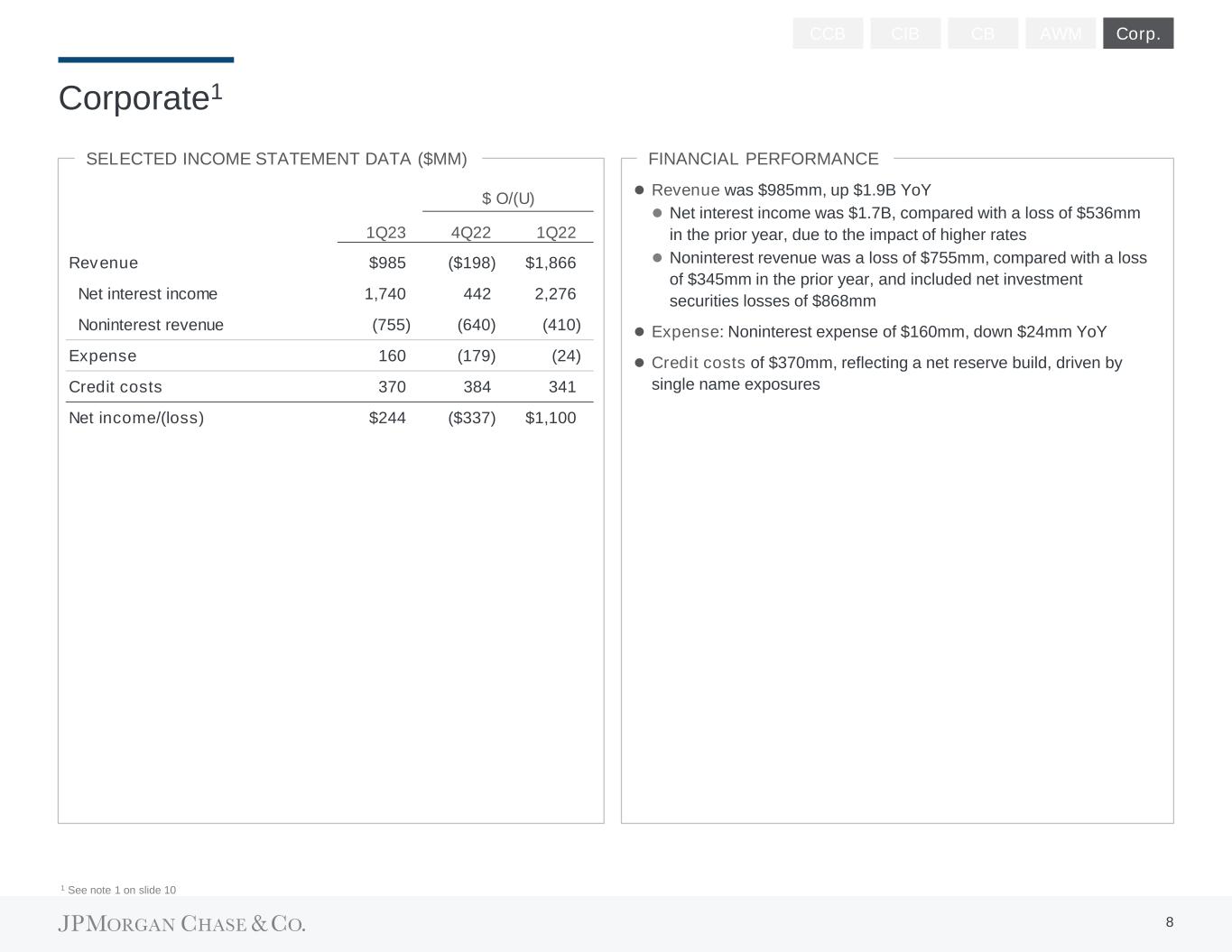 Asset & Wealth Management1 KEY DRIVERS / STATISTICS ($B)2 ⚫ Net income of $1.4B, up 36% YoY ⚫ Revenue of $4.8B, up 11% YoY, driven by higher deposit margins on lower balances and a valuation gain of $339mm on the Firm’s initial investment in the Asset Management joint venture in China as a result of taking 100% ownership, partially offset by the impact of lower average market levels on management fees and lower performance fees ⚫ Expense of $3.1B, up 8% YoY, predominantly driven by higher compensation, including headcount growth, higher revenue-related compensation and the impact of acquisitions ⚫ AUM of $3.0T was up 2% YoY and client assets of $4.3T were up 6% YoY, driven by continued net inflows ⚫ For the quarter, AUM had long-term net inflows of $47B and liquidity net inflows of $93B ⚫ Average loans of $211B, down 1% YoY and down 1% QoQ ⚫ Average deposits of $224B, down 22% YoY and down 5% QoQ 1 See note 1 on slide 10 2 Actual numbers for all periods, not over/(under) SELECTED INCOME STATEMENT DATA ($MM) FINANCIAL PERFORMANCE 1Q23 4Q22 1Q22 Revenue $4,784 $196 $469 Asset Management 2,434 276 120 Global Private Bank 2,350 (80) 349 Expense 3,091 69 231 Credit costs 28 (4) (126) Net income $1,367 $233 $359 $ O/(U) 1Q23 4Q22 1Q22 Equity $16.0 $17.0 $17.0 ROE 34% 26% 23% Pretax margin 35 33 30 Assets under management ("AUM") $3,006 $2,766 $2,960 Client assets 4,347 4,048 4,116 Average loans 211.5 214.2 214.6 Average deposits 224.4 237.0 287.8 CCB CIB CB AWM Corp. 7