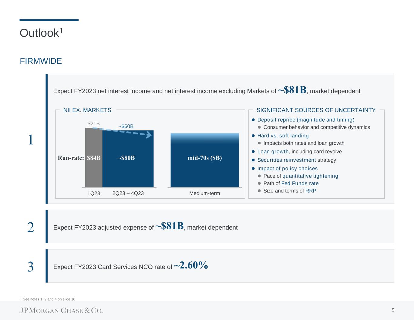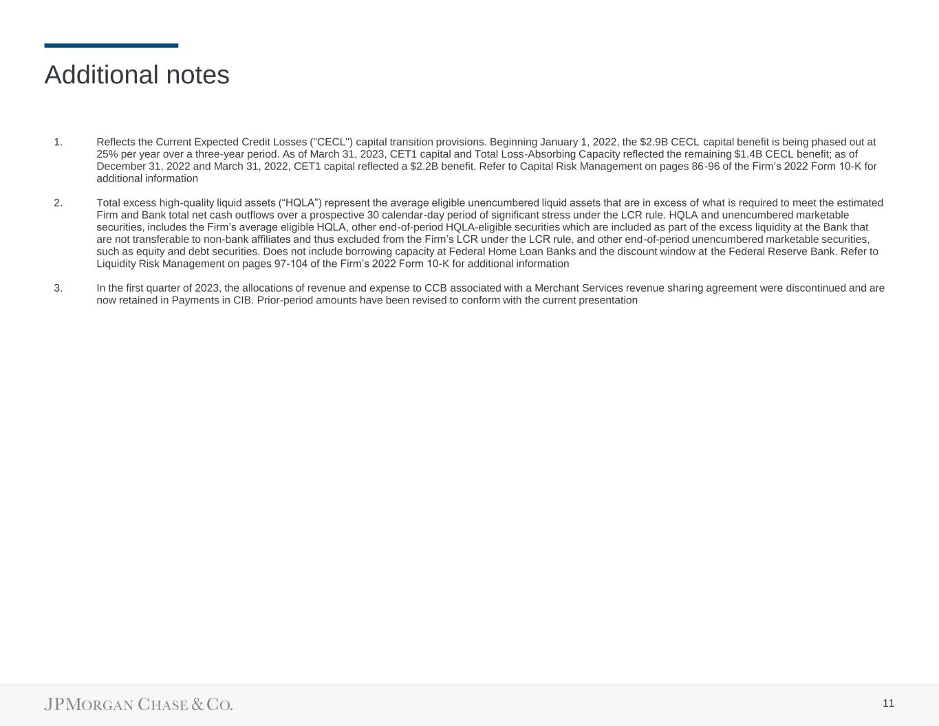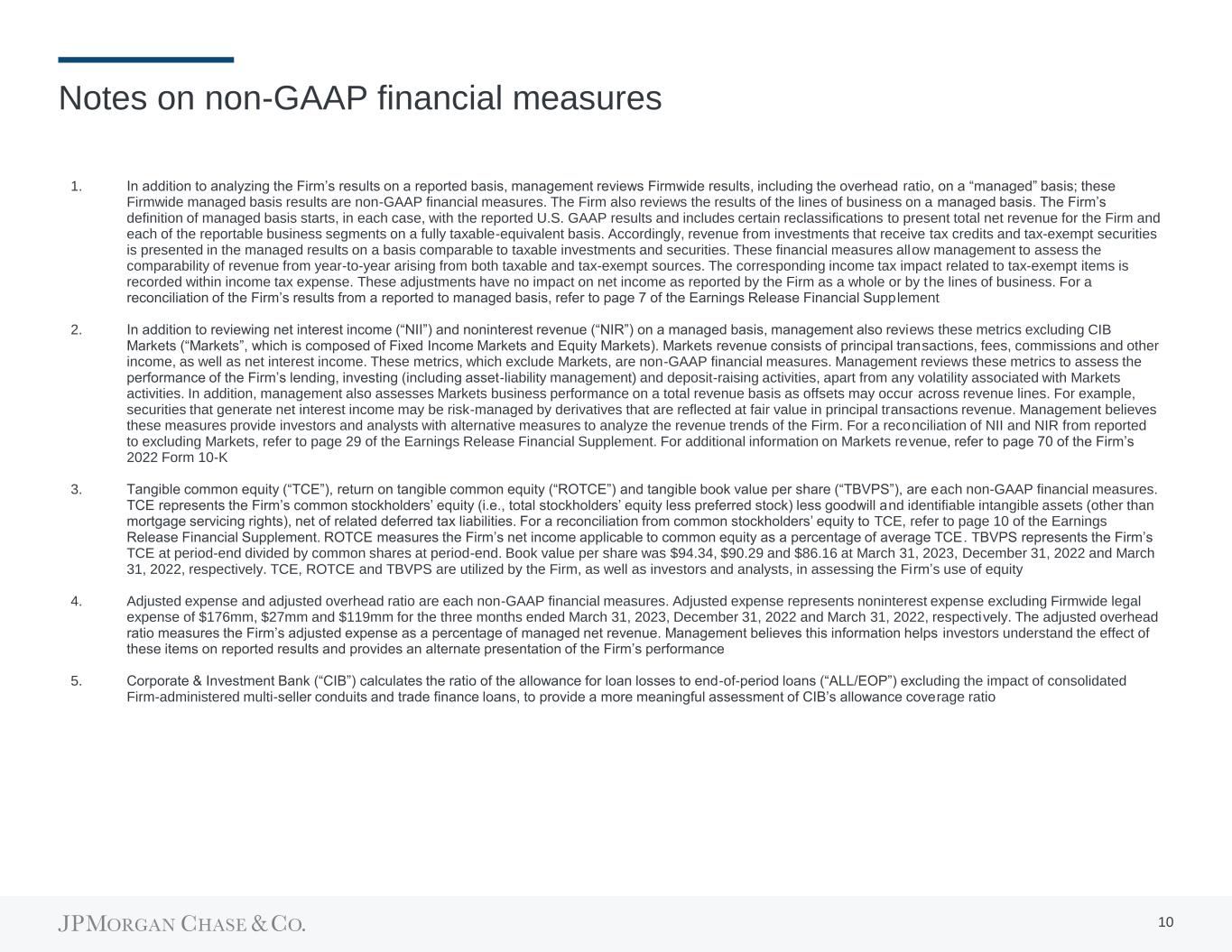 Notes on non-GAAP financial measures 1. In addition to analyzing the Firm’s results on a reported basis, management reviews Firmwide results, including the overhead ratio, on a “managed” basis; these Firmwide managed basis results are non-GAAP financial measures. The Firm also reviews the results of the lines of business on a managed basis. The Firm’s definition of managed basis starts, in each case, with the reported U.S. GAAP results and includes certain reclassifications to present total net revenue for the Firm and each of the reportable business segments on a fully taxable-equivalent basis. Accordingly, revenue from investments that receive tax credits and tax-exempt securities is presented in the managed results on a basis comparable to taxable investments and securities. These financial measures allow management to assess the comparability of revenue from year-to-year arising from both taxable and tax-exempt sources. The corresponding income tax impact related to tax-exempt items is recorded within income tax expense. These adjustments have no impact on net income as reported by the Firm as a whole or by the lines of business. For a reconciliation of the Firm’s results from a reported to managed basis, refer to page 7 of the Earnings Release Financial Supp lement 2. In addition to reviewing net interest income (“NII”) and noninterest revenue (“NIR”) on a managed basis, management also reviews these metrics excluding CIB Markets (“Markets”, which is composed of Fixed Income Markets and Equity Markets). Markets revenue consists of principal transactions, fees, commissions and other income, as well as net interest income. These metrics, which exclude Markets, are non-GAAP financial measures. Management reviews these metrics to assess the performance of the Firm’s lending, investing (including asset-liability management) and deposit-raising activities, apart from any volatility associated with Markets activities. In addition, management also assesses Markets business performance on a total revenue basis as offsets may occur across revenue lines. For example, securities that generate net interest income may be risk-managed by derivatives that are reflected at fair value in principal transactions revenue. Management believes these measures provide investors and analysts with alternative measures to analyze the revenue trends of the Firm. For a reconciliation of NII and NIR from reported to excluding Markets, refer to page 29 of the Earnings Release Financial Supplement. For additional information on Markets revenue, refer to page 70 of the Firm’s 2022 Form 10-K 3. Tangible common equity (“TCE”), return on tangible common equity (“ROTCE”) and tangible book value per share (“TBVPS”), are each non-GAAP financial measures. TCE represents the Firm’s common stockholders’ equity (i.e., total stockholders’ equity less preferred stock) less goodwill and identifiable intangible assets (other than mortgage servicing rights), net of related deferred tax liabilities. For a reconciliation from common stockholders’ equity to TCE, refer to page 10 of the Earnings Release Financial Supplement. ROTCE measures the Firm’s net income applicable to common equity as a percentage of average TCE . TBVPS represents the Firm’s TCE at period-end divided by common shares at period-end. Book value per share was $94.34, $90.29 and $86.16 at March 31, 2023, December 31, 2022 and March 31, 2022, respectively. TCE, ROTCE and TBVPS are utilized by the Firm, as well as investors and analysts, in assessing the Firm’s use of equity 4. Adjusted expense and adjusted overhead ratio are each non-GAAP financial measures. Adjusted expense represents noninterest expense excluding Firmwide legal expense of $176mm, $27mm and $119mm for the three months ended March 31, 2023, December 31, 2022 and March 31, 2022, respectively. The adjusted overhead ratio measures the Firm’s adjusted expense as a percentage of managed net revenue. Management believes this information helps investors understand the effect of these items on reported results and provides an alternate presentation of the Firm’s performance 5. Corporate & Investment Bank (“CIB”) calculates the ratio of the allowance for loan losses to end-of-period loans (“ALL/EOP”) excluding the impact of consolidated Firm-administered multi-seller conduits and trade finance loans, to provide a more meaningful assessment of CIB’s allowance coverage ratio 10