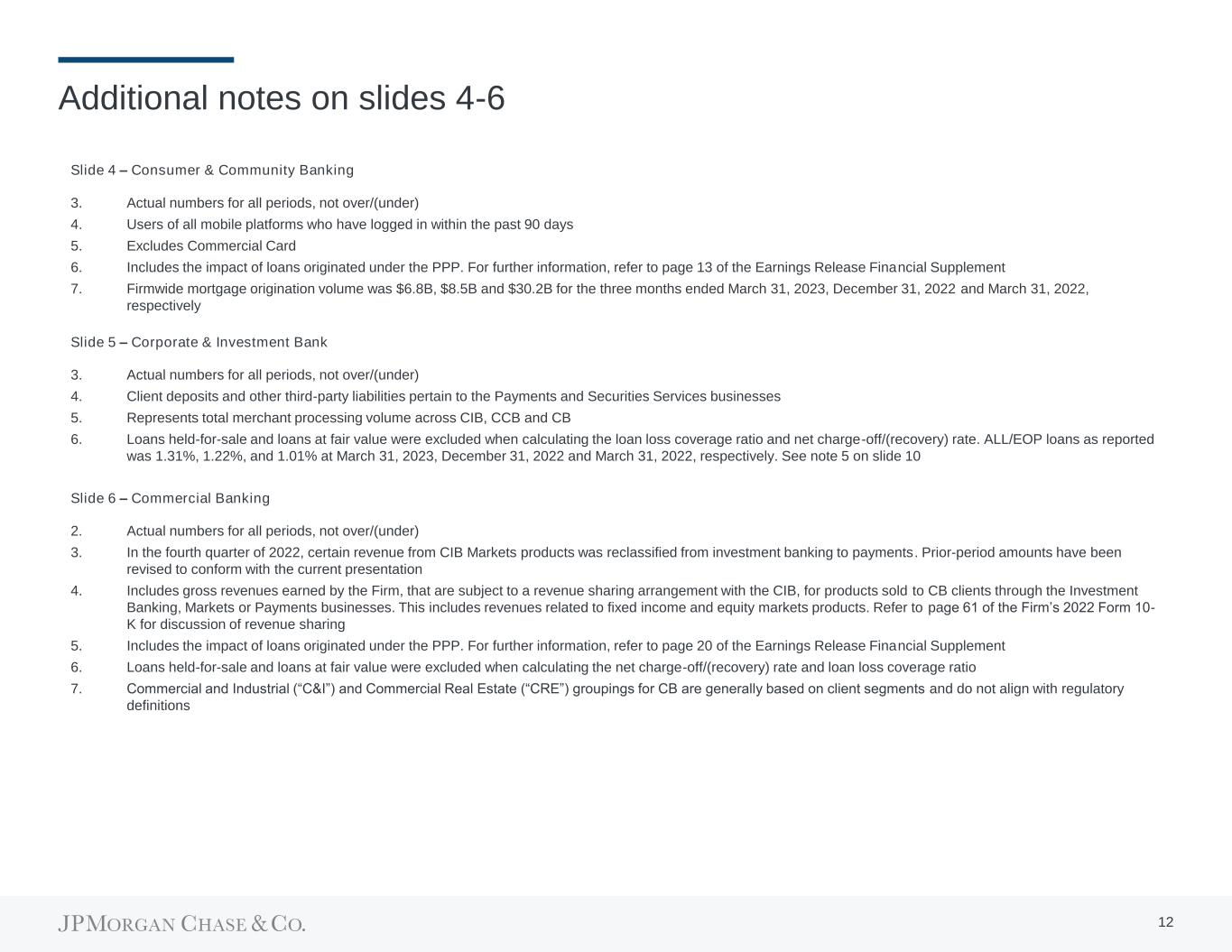 Additional notes on slides 4-6 Slide 4 – Consumer & Community Banking 3. Actual numbers for all periods, not over/(under) 4. Users of all mobile platforms who have logged in within the past 90 days 5. Excludes Commercial Card 6. Includes the impact of loans originated under the PPP. For further information, refer to page 13 of the Earnings Release Financial Supplement 7. Firmwide mortgage origination volume was $6.8B, $8.5B and $30.2B for the three months ended March 31, 2023, December 31, 2022 and March 31, 2022, respectively Slide 5 – Corporate & Investment Bank 3. Actual numbers for all periods, not over/(under) 4. Client deposits and other third-party liabilities pertain to the Payments and Securities Services businesses 5. Represents total merchant processing volume across CIB, CCB and CB 6. Loans held-for-sale and loans at fair value were excluded when calculating the loan loss coverage ratio and net charge-off/(recovery) rate. ALL/EOP loans as reported was 1.31%, 1.22%, and 1.01% at March 31, 2023, December 31, 2022 and March 31, 2022, respectively. See note 5 on slide 10 Slide 6 – Commercial Banking 2. Actual numbers for all periods, not over/(under) 3. In the fourth quarter of 2022, certain revenue from CIB Markets products was reclassified from investment banking to payments. Prior-period amounts have been revised to conform with the current presentation 4. Includes gross revenues earned by the Firm, that are subject to a revenue sharing arrangement with the CIB, for products sold to CB clients through the Investment Banking, Markets or Payments businesses. This includes revenues related to fixed income and equity markets products. Refer to page 61 of the Firm’s 2022 Form 10- K for discussion of revenue sharing 5. Includes the impact of loans originated under the PPP. For further information, refer to page 20 of the Earnings Release Financial Supplement 6. Loans held-for-sale and loans at fair value were excluded when calculating the net charge-off/(recovery) rate and loan loss coverage ratio 7. Commercial and Industrial (“C&I”) and Commercial Real Estate (“CRE”) groupings for CB are generally based on client segments and do not align with regulatory definitions 12