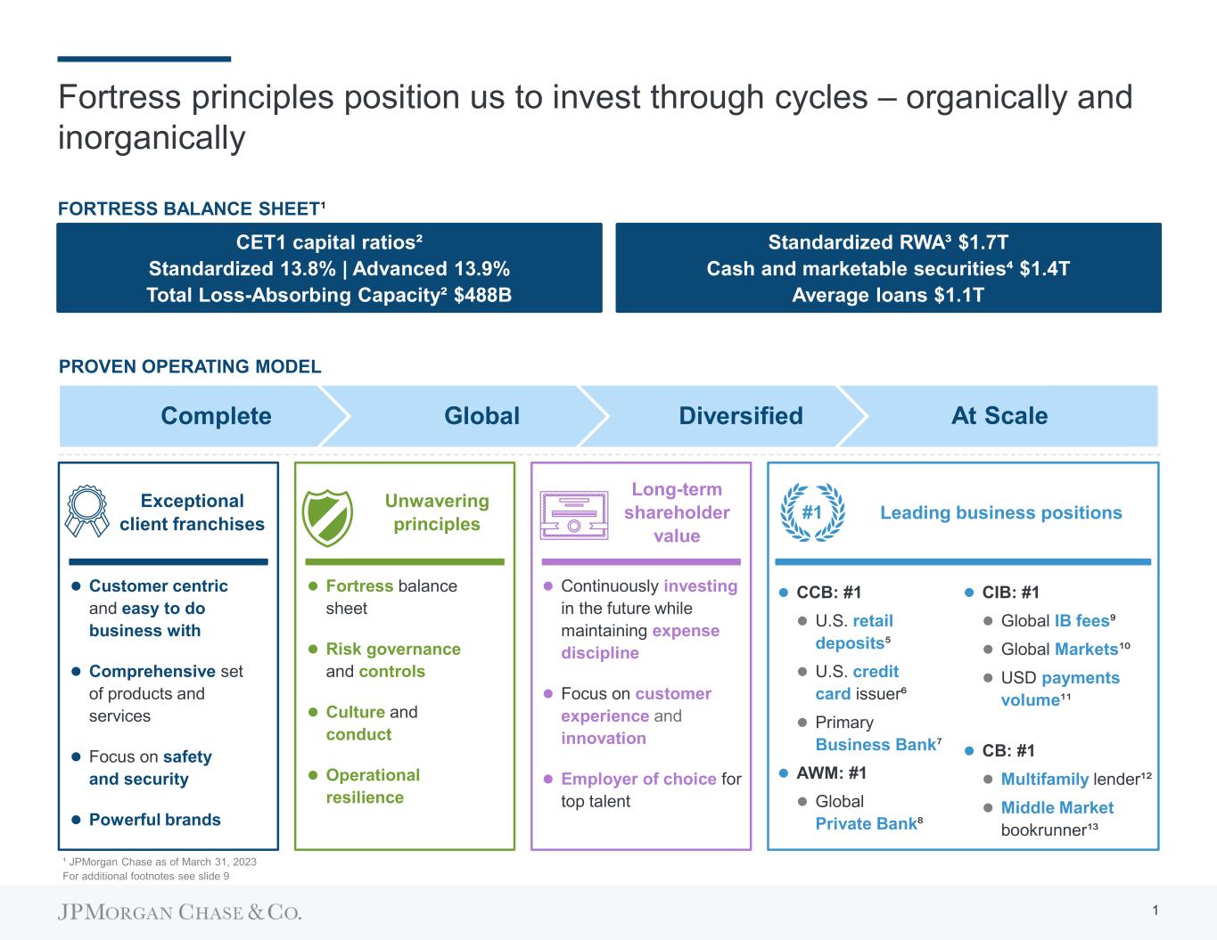 Fortress principles position us to invest through cycles – organically and inorganically  Fortress balance sheet  Risk governance and controls  Culture and conduct  Operational resilience  Customer centric and easy to do business with  Comprehensive set of products and services  Focus on safety and security  Powerful brands  Continuously investing in the future while maintaining expense discipline  Focus on customer experience and innovation  Employer of choice for top talent Unwavering principles Exceptional client franchises Long-term shareholder value Leading business positions#1 Complete Global Diversified At Scale FORTRESS BALANCE SHEET¹ ¹ JPMorgan Chase as of March 31, 2023 For additional footnotes see slide 9 CET1 capital ratios² Standardized 13.8% | Advanced 13.9% Total Loss-Absorbing Capacity² $488B Standardized RWA³ $1.7T Cash and marketable securities⁴ $1.4T Average loans $1.1T  CIB: #1  Global IB fees⁹  Global Markets¹⁰  USD payments volume¹¹  CB: #1  Multifamily lender¹²  Middle Market bookrunner¹³  CCB: #1  U.S. retail deposits⁵  U.S. credit card issuer⁶  Primary Business Bank⁷  AWM: #1  Global Private Bank⁸ PROVEN OPERATING MODEL 1