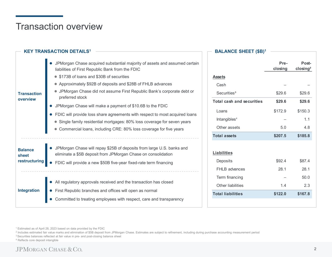 Pre- closing Post- closing² Assets Cash – – Securities³ $29.6 $29.6 Total cash and securities $29.6 $29.6 Loans $172.9 $150.3 Intangibles – 1.1 Other assets 5.0 4.8 Total assets $207.5 $185.8 Liabilities Deposits $92.4 $87.4 FHLB advances 28.1 28.1 Term financing – 50.0 Other liabilities 1.4 2.3 Total liabilities $122.0 $167.8 Transaction overview ¹ Estimated as of April 28, 2023 based on data provided by the FDIC 2 Includes estimated fair value marks and elimination of $5B deposit from JPMorgan Chase. Estimates are subject to refinement, including during purchase accounting measurement period 3 Securities balances reflected at fair value in pre- and post-closing balance sheet 4 Reflects core deposit intangible BALANCE SHEET ($B)1KEY TRANSACTION DETAILS1  JPMorgan Chase acquired substantial majority of assets and assumed certain liabilities of First Republic Bank from the FDIC  $173B of loans and $30B of securities  Approximately $92B of deposits and $28B of FHLB advances  JPMorgan Chase did not assume First Republic Bank’s corporate debt or preferred stock  JPMorgan Chase will make a payment of $10.6B to the FDIC  FDIC will provide loss share agreements with respect to most acquired loans  Single family residential mortgages: 80% loss coverage for seven years  Commercial loans, including CRE: 80% loss coverage for five years Transaction overview Balance sheet restructuring  All regulatory approvals received and the transaction has closed  First Republic branches and offices will open as normal  Committed to treating employees with respect, care and transparency Integration  JPMorgan Chase will repay $25B of deposits from large U.S. banks and eliminate a $5B deposit from JPMorgan Chase on consolidation  FDIC will provide a new $50B five-year fixed-rate term financing 2 4