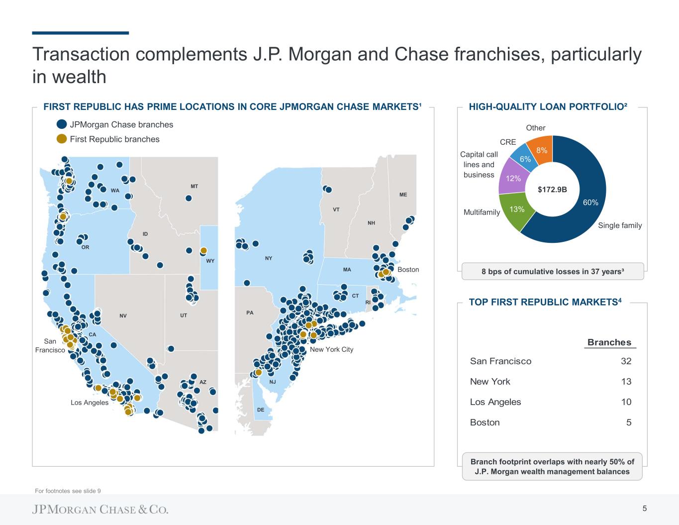Transaction rationale Accelerates key growth opportunities  Increases penetration with U.S. high net worth clients  Accelerates U.S. wealth strategy by adding J.P. Morgan wealth centers in attractive locations  Complementary to JPMorgan Chase’s #1 business bank Financially attractive  >$500mm net income accretion1  Tangible book value per share accretive  IRR > 20% High-quality portfolio with additional protection  Strong credit profile supplemented by FDIC loss sharing agreement  Loan portfolio marks supported by due diligence process  Maintains JPMorgan Chase’s fortress balance sheet Contributes to rapid and orderly resolution  First Republic depositors will be backed by the strength of JPMorgan Chase  Lowest cost and most efficient option for the Deposit Insurance Fund  Our capabilities and capital strength enabled a competitive bid ¹ Accretion excluding bargain purchase gain in 2023 and restructuring costs expected in 2023 and 2024 4