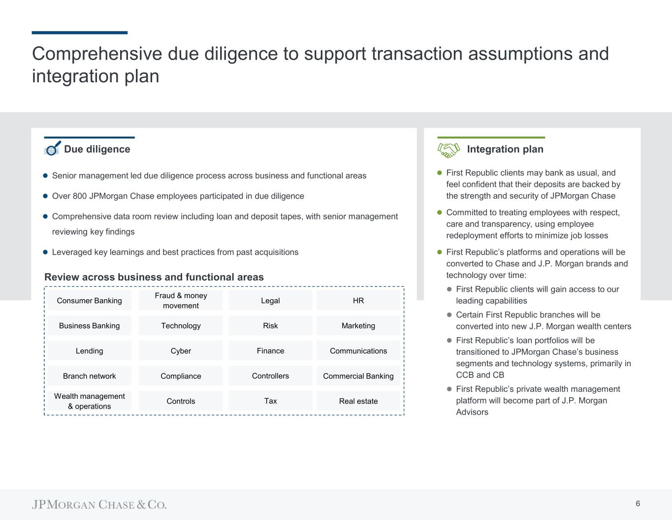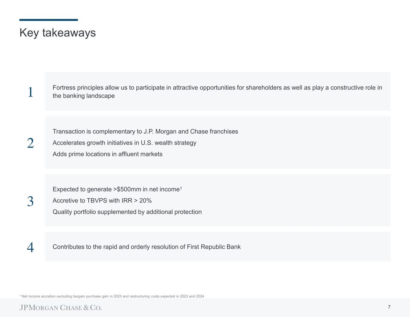 Comprehensive due diligence to support transaction assumptions and integration plan  Senior management led due diligence process across business and functional areas  Over 800 JPMorgan Chase employees participated in due diligence  Comprehensive data room review including loan and deposit tapes, with senior management reviewing key findings  Leveraged key learnings and best practices from past acquisitions Due diligence  First Republic clients may bank as usual, and feel confident that their deposits are backed by the strength and security of JPMorgan Chase  Committed to treating employees with respect, care and transparency, using employee redeployment efforts to minimize job losses  First Republic’s platforms and operations will be converted to Chase and J.P. Morgan brands and technology over time:  First Republic clients will gain access to our leading capabilities  Certain First Republic branches will be converted into new J.P. Morgan wealth centers  First Republic’s loan portfolios will be transitioned to JPMorgan Chase’s business segments and technology systems, primarily in CCB and CB  First Republic’s private wealth management platform will become part of J.P. Morgan Advisors Integration plan Consumer Banking Business Banking Lending Fraud & money movement Wealth management & operations Branch network Technology Cyber Compliance Controls Legal Risk Finance Controllers Marketing HR Tax Communications Commercial Banking Real estate Review across business and functional areas 6