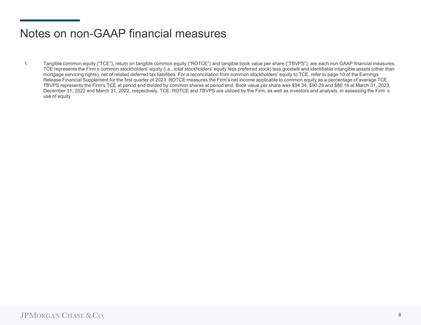 Notes on non-GAAP financial measures 1. Tangible common equity (“TCE”), return on tangible common equity (“ROTCE”) and tangible book value per share (“TBVPS”), are each non GAAP financial measures. TCE represents the Firm’s common stockholders’ equity (i.e., total stockholders’ equity less preferred stock) less goodwill and identifiable intangible assets (other than mortgage servicing rights), net of related deferred tax liabilities. For a reconciliation from common stockholders’ equity to TCE, refer to page 10 of the Earnings Release Financial Supplement for the first quarter of 2023. ROTCE measures the Firm’s net income applicable to common equity as a percentage of average TCE. TBVPS represents the Firm’s TCE at period end divided by common shares at period end. Book value per share was $94.34, $90.29 and $86.16 at March 31, 2023, December 31, 2022 and March 31, 2022, respectively. TCE, ROTCE and TBVPS are utilized by the Firm, as well as investors and analysts, in assessing the Firm’ s use of equity 8