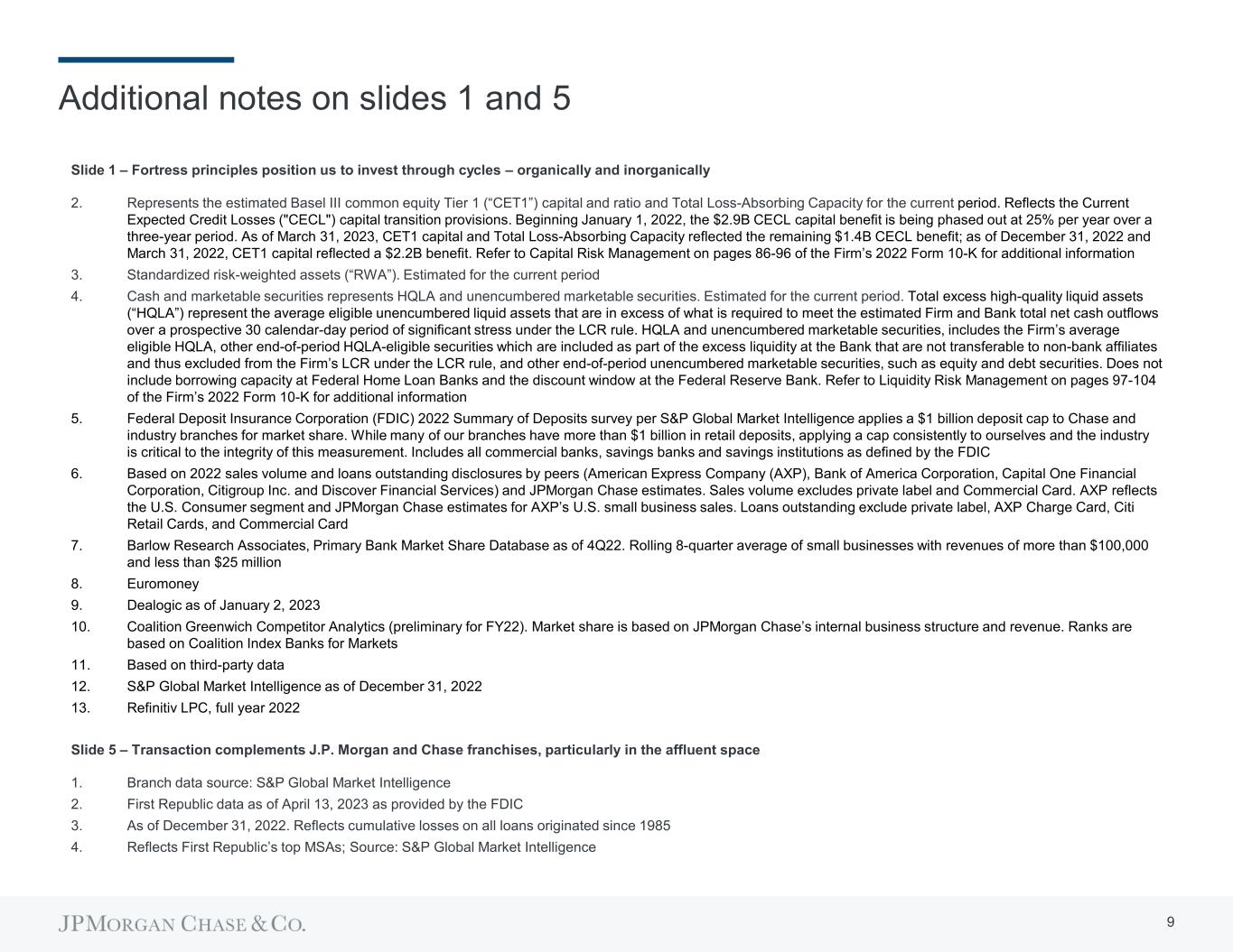 Additional notes on slides 1 and 5 Slide 1 – Fortress principles position us to invest through cycles – organically and inorganically 2. Represents the estimated Basel III common equity Tier 1 (“CET1”) capital and ratio and Total Loss-Absorbing Capacity for the current period. Reflects the Current Expected Credit Losses ("CECL") capital transition provisions. Beginning January 1, 2022, the $2.9B CECL capital benefit is being phased out at 25% per year over a three-year period. As of March 31, 2023, CET1 capital and Total Loss-Absorbing Capacity reflected the remaining $1.4B CECL benefit; as of December 31, 2022 and March 31, 2022, CET1 capital reflected a $2.2B benefit. Refer to Capital Risk Management on pages 86-96 of the Firm’s 2022 Form 10-K for additional information 3. Standardized risk-weighted assets (“RWA”). Estimated for the current period 4. Cash and marketable securities represents HQLA and unencumbered marketable securities. Estimated for the current period. Total excess high-quality liquid assets (“HQLA”) represent the average eligible unencumbered liquid assets that are in excess of what is required to meet the estimated Firm and Bank total net cash outflows over a prospective 30 calendar-day period of significant stress under the LCR rule. HQLA and unencumbered marketable securities, includes the Firm’s average eligible HQLA, other end-of-period HQLA-eligible securities which are included as part of the excess liquidity at the Bank that are not transferable to non-bank affiliates and thus excluded from the Firm’s LCR under the LCR rule, and other end-of-period unencumbered marketable securities, such as equity and debt securities. Does not include borrowing capacity at Federal Home Loan Banks and the discount window at the Federal Reserve Bank. Refer to Liquidity Risk Management on pages 97-104 of the Firm’s 2022 Form 10-K for additional information 5. Federal Deposit Insurance Corporation (FDIC) 2022 Summary of Deposits survey per S&P Global Market Intelligence applies a $1 billion deposit cap to Chase and industry branches for market share. While many of our branches have more than $1 billion in retail deposits, applying a cap consistently to ourselves and the industry is critical to the integrity of this measurement. Includes all commercial banks, savings banks and savings institutions as defined by the FDIC 6. Based on 2022 sales volume and loans outstanding disclosures by peers (American Express Company (AXP), Bank of America Corporation, Capital One Financial Corporation, Citigroup Inc. and Discover Financial Services) and JPMorgan Chase estimates. Sales volume excludes private label and Commercial Card. AXP reflects the U.S. Consumer segment and JPMorgan Chase estimates for AXP’s U.S. small business sales. Loans outstanding exclude private label, AXP Charge Card, Citi Retail Cards, and Commercial Card 7. Barlow Research Associates, Primary Bank Market Share Database as of 4Q22. Rolling 8-quarter average of small businesses with revenues of more than $100,000 and less than $25 million 8. Euromoney 9. Dealogic as of January 2, 2023 10. Coalition Greenwich Competitor Analytics (preliminary for FY22). Market share is based on JPMorgan Chase’s internal business structure and revenue. Ranks are based on Coalition Index Banks for Markets 11. Based on third-party data 12. S&P Global Market Intelligence as of December 31, 2022 13. Refinitiv LPC, full year 2022 Slide 5 – Transaction complements J.P. Morgan and Chase franchises, particularly in the affluent space 1. Branch data source: S&P Global Market Intelligence 2. First Republic data as of April 13, 2023 as provided by the FDIC 3. As of December 31, 2022. Reflects cumulative losses on all loans originated since 1985 4. Reflects First Republic’s top MSAs; Source: S&P Global Market Intelligence 9