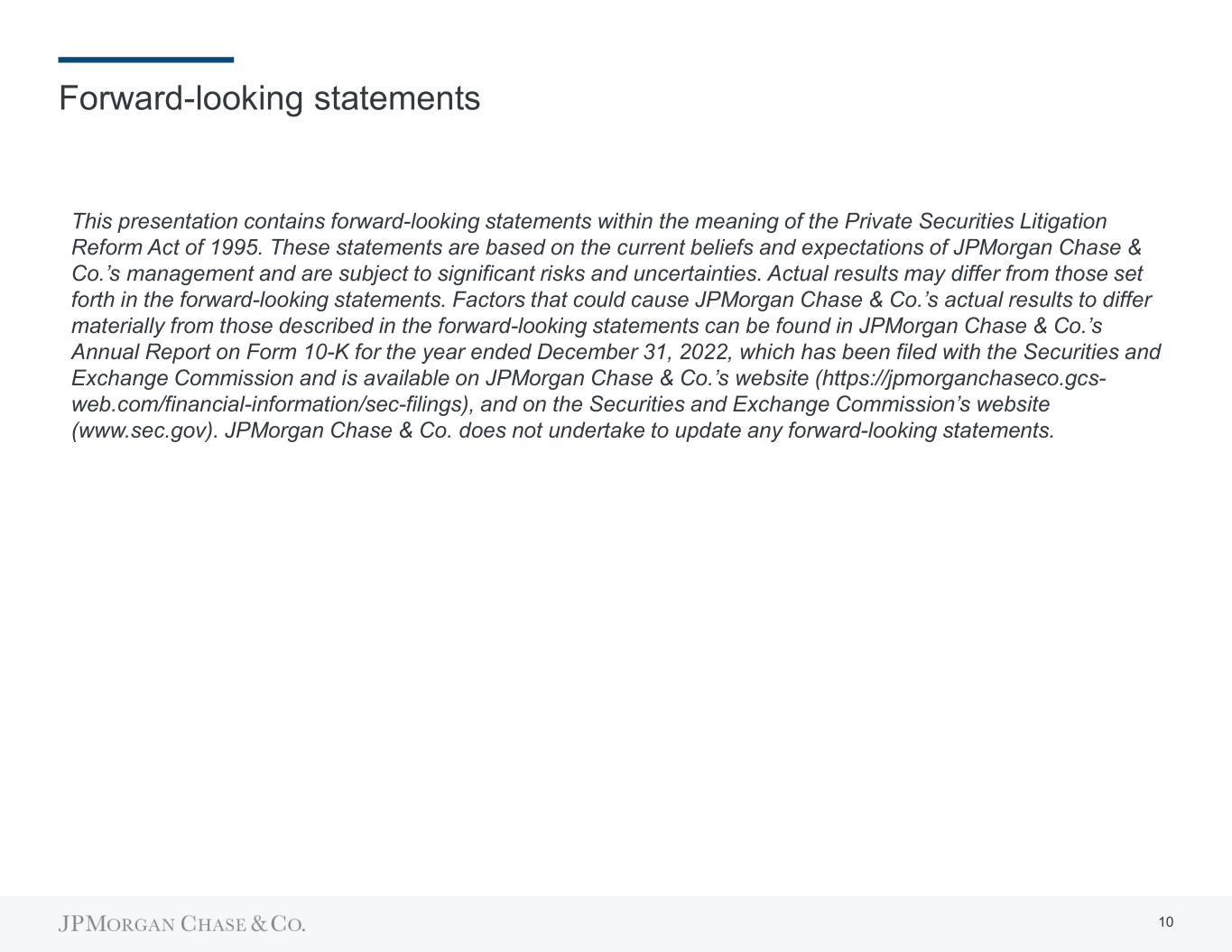 Forward-looking statements This presentation contains forward-looking statements within the meaning of the Private Securities Litigation Reform Act of 1995. These statements are based on the current beliefs and expectations of JPMorgan Chase & Co.’s management and are subject to significant risks and uncertainties. Actual results may differ from those set forth in the forward-looking statements. Factors that could cause JPMorgan Chase & Co.’s actual results to differ materially from those described in the forward-looking statements can be found in JPMorgan Chase & Co.’s Annual Report on Form 10-K for the year ended December 31, 2022, which has been filed with the Securities and Exchange Commission and is available on JPMorgan Chase & Co.’s website (https://jpmorganchaseco.gcs- web.com/financial-information/sec-filings), and on the Securities and Exchange Commission’s website (www.sec.gov). JPMorgan Chase & Co. does not undertake to update any forward-looking statements. 10