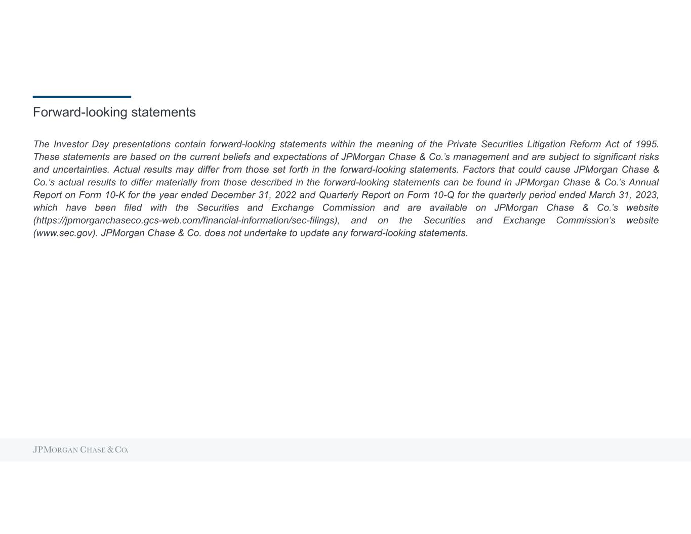 Forward-looking statements The Investor Day presentations contain forward-looking statements within the meaning of the Private Securities Litigation Reform Act of 1995. These statements are based on the current beliefs and expectations of JPMorgan Chase & Co. management and are subject to significant risks and uncertainties. Actual results may differ from those set forth in the forward-looking statements. Factors that could cause JPMorgan Chase & Co. actual results to differ materially from those described in the forward-looking statements can be found in JPMorgan Chase & Co. Annual Report on Form 10-K for the year ended December 31, 2022 and Quarterly Report on Form 10-Q for the quarterly period ended March 31, 2023, which have been filed with the Securities and Exchange Commission and are available on JPMorgan Chase & Co. website (https://jpmorganchaseco.gcs-web.com/financial-information/sec-filings), and on the Securities and Exchange website (www.sec.gov). JPMorgan Chase & Co. does not undertake to update any forward-looking statements.