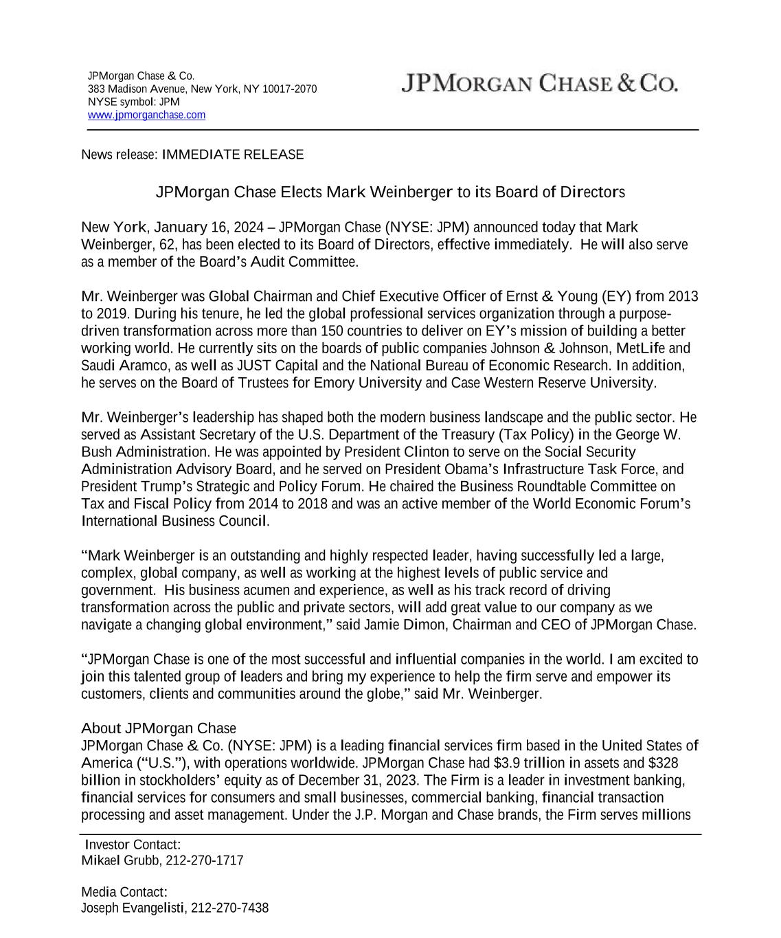 JPMorgan Chase & Co. 383 Madison Avenue, New York, NY 10017-2070 NYSE symbol: JPM www.jpmorganchase.com News release: IMMEDIATE RELEASE Investor Contact: Mikael Grubb, 212-270-1717 Media Contact: Joseph Evangelisti, 212-270-7438 JPMorgan Chase Elects Mark Weinberger to its Board of Directors New York, January 16, 2024 – JPMorgan Chase (NYSE: JPM) announced today that Mark Weinberger, 62, has been elected to its Board of Directors, effective immediately. He will also serve as a member of the Board’s Audit Committee. Mr. Weinberger was Global Chairman and Chief Executive Officer of Ernst & Young (EY) from 2013 to 2019. During his tenure, he led the global professional services organization through a purpose- driven transformation across more than 150 countries to deliver on EY’s mission of building a better working world. He currently sits on the boards of public companies Johnson & Johnson, MetLife and Saudi Aramco, as well as JUST Capital and the National Bureau of Economic Research. In addition, he serves on the Board of Trustees for Emory University and Case Western Reserve University. Mr. Weinberger’s leadership has shaped both the modern business landscape and the public sector. He served as Assistant Secretary of the U.S. Department of the Treasury (Tax Policy) in the George W. Bush Administration. He was appointed by President Clinton to serve on the Social Security Administration Advisory Board, and he served on President Obama’s Infrastructure Task Force, and President Trump’s Strategic and Policy Forum. He chaired the Business Roundtable Committee on Tax and Fiscal Policy from 2014 to 2018 and was an active member of the World Economic Forum’s International Business Council. “Mark Weinberger is an outstanding and highly respected leader, having successfully led a large, complex, global company, as well as working at the highest levels of public service and government. His business acumen and experience, as well as his track record of driving transformation across the public and private sectors, will add great value to our company as we navigate a changing global environment,” said Jamie Dimon, Chairman and CEO of JPMorgan Chase. “JPMorgan Chase is one of the most successful and influential companies in the world. I am excited to join this talented group of leaders and bring my experience to help the firm serve and empower its customers, clients and communities around the globe,” said Mr. Weinberger. About JPMorgan Chase JPMorgan Chase & Co. (NYSE: JPM) is a leading financial services firm based in the United States of America (“U.S.”), with operations worldwide. JPMorgan Chase had $3.9 trillion in assets and $328 billion in stockholders’ equity as of December 31, 2023. The Firm is a leader in investment banking, financial services for consumers and small businesses, commercial banking, financial transaction processing and asset management. Under the J.P. Morgan and Chase brands, the Firm serves millions