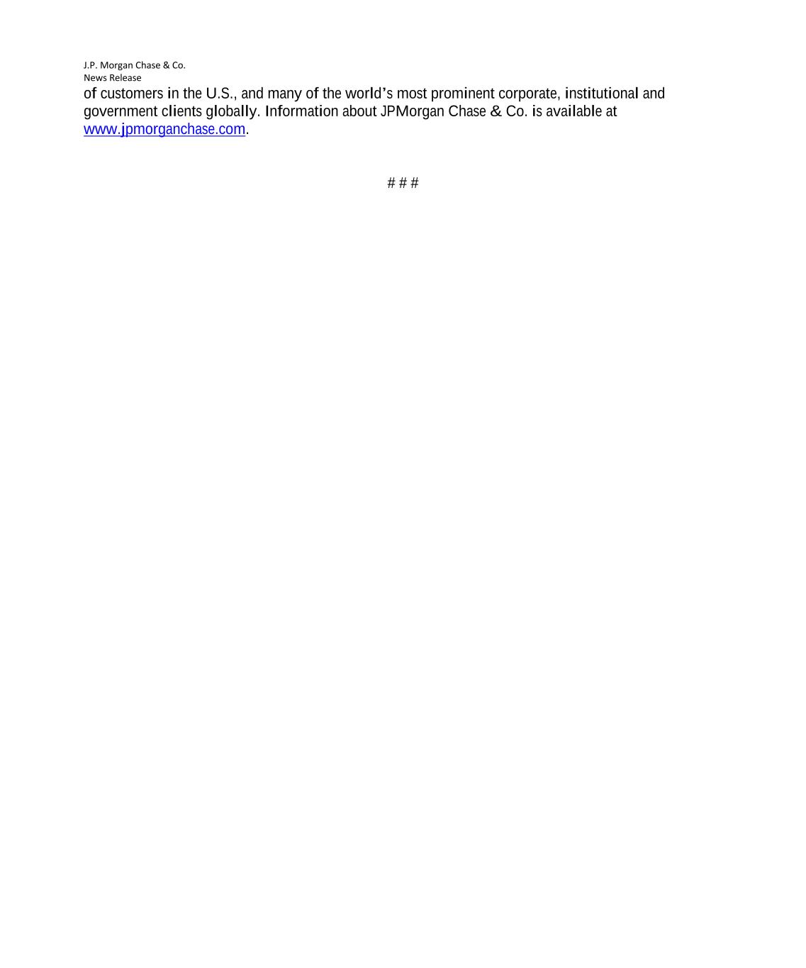 J.P. Morgan Chase & Co. News Release of customers in the U.S., and many of the world’s most prominent corporate, institutional and government clients globally. Information about JPMorgan Chase & Co. is available at www.jpmorganchase.com. # # #