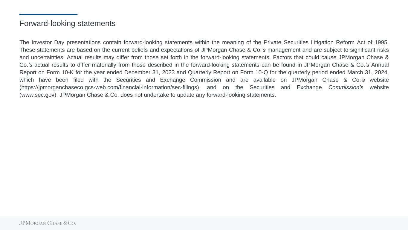 Forward-looking statements The Investor Day presentations contain forward-looking statements within the meaning of the Private Securities Litigation Reform Act of 1995. These statements are based on the current beliefs and expectations of JPMorgan Chase & Co.’s management and are subject to significant risks and uncertainties. Actual results may differ from those set forth in the forward-looking statements. Factors that could cause JPMorgan Chase & Co.’s actual results to differ materially from those described in the forward-looking statements can be found in JPMorgan Chase & Co.’s Annual Report on Form 10-K for the year ended December 31, 2023 and Quarterly Report on Form 10-Q for the quarterly period ended March 31, 2024, which have been filed with the Securities and Exchange Commission and are available on JPMorgan Chase & Co.’s website (https://jpmorganchaseco.gcs-web.com/financial-information/sec-filings), and on the Securities and Exchange Commission’s website (www.sec.gov). JPMorgan Chase & Co. does not undertake to update any forward-looking statements.